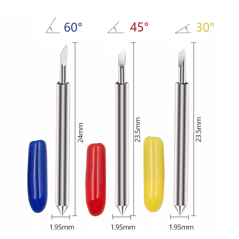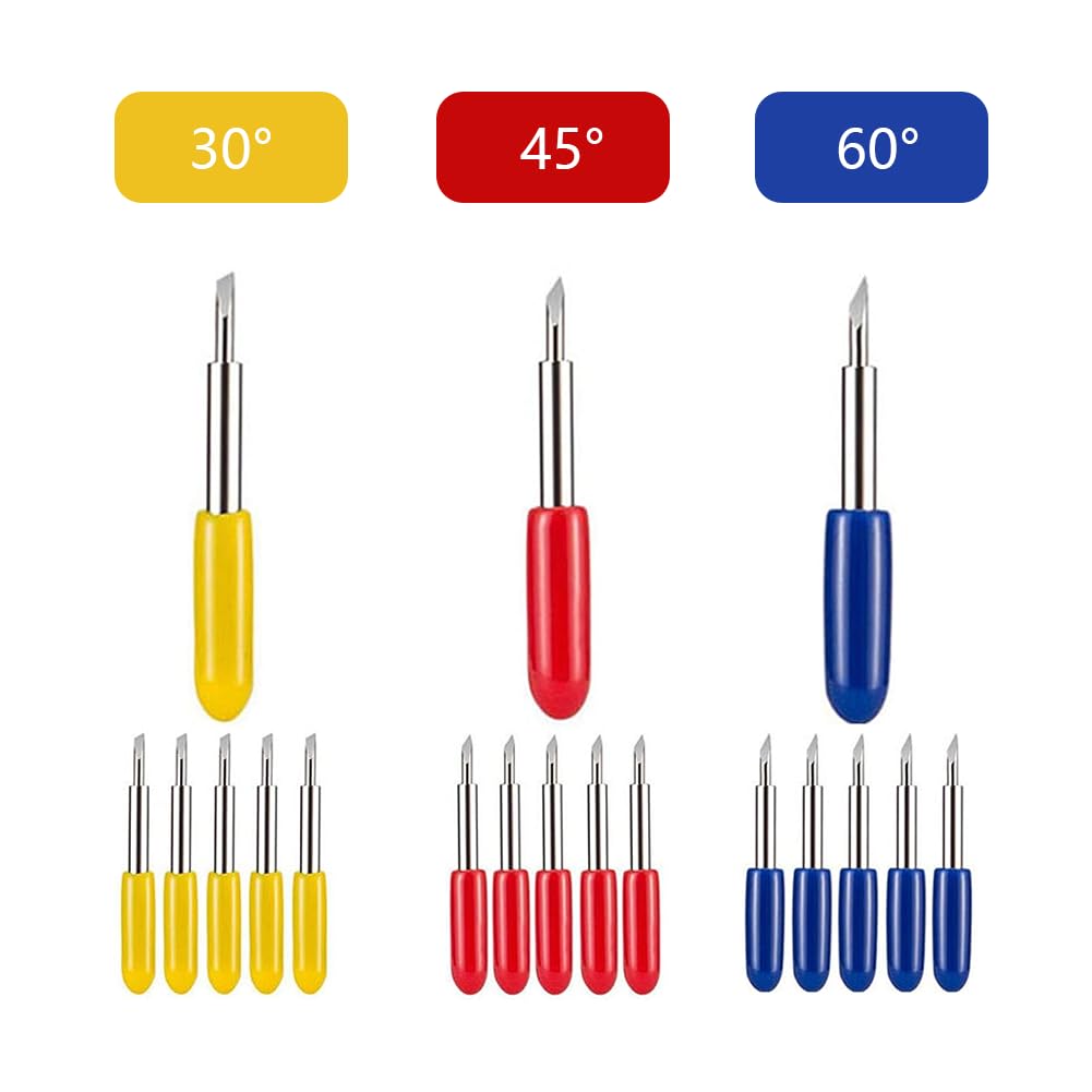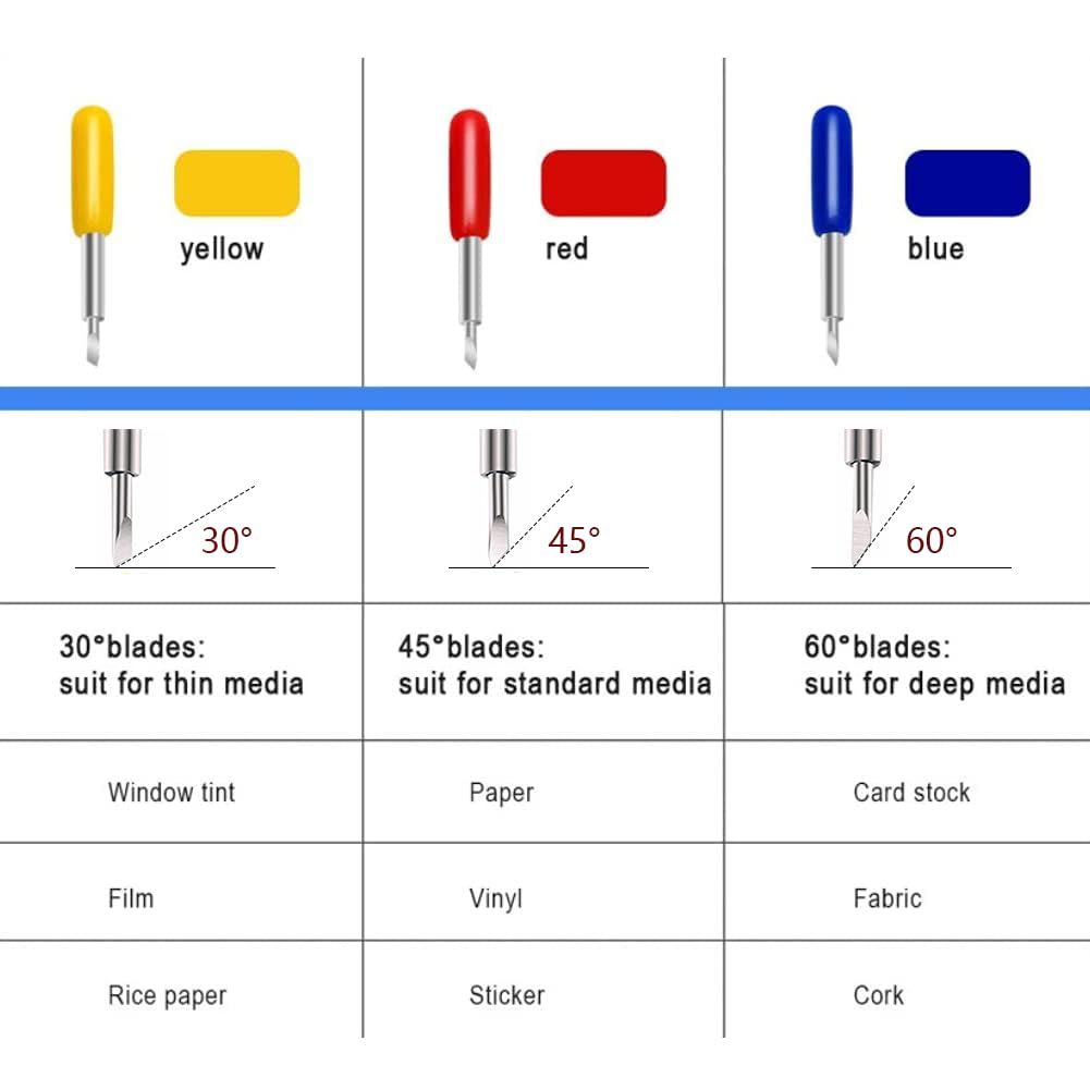 High Quality: The vinyl cutter blades is made of tungsten carbide material with high hardness, and is equipped with a spring and blade support base, 5 pcs for each degree