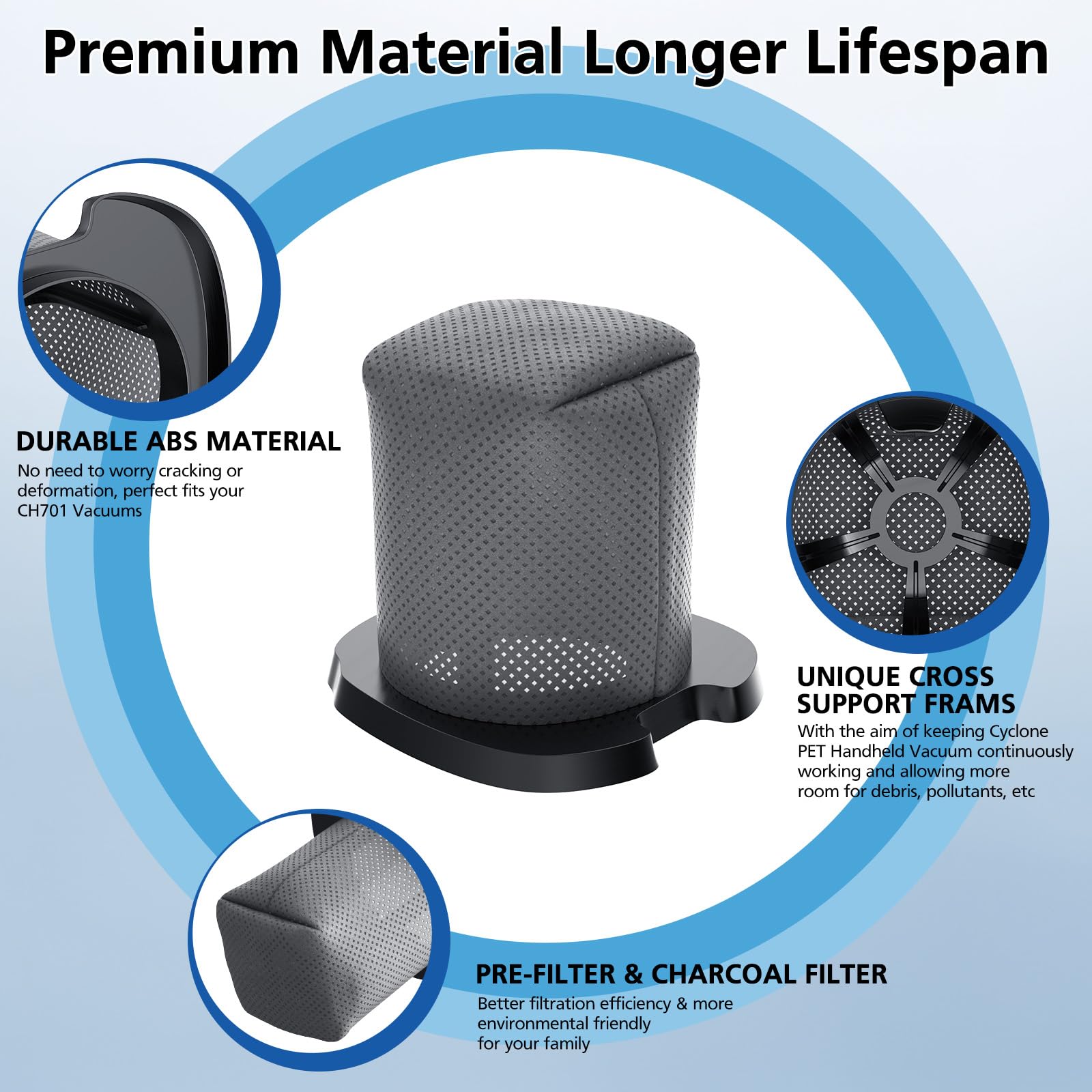 【Perfect Fit for Shark CH701 Vacuums】 CH701 Vacuum Filter Replacement Compatible with Shark Cyclone PET Handheld Vacuum CH700, CH701, CH701C and CH700WM, Compare to Part# XDCFCH700. Our filters ensure a perfect fit and seamless integration, enhancing your vacuuming experience. NOTE: Only compatible with Shark Cyclone PET Handheld Vacuum CH700, CH701, CH701C and CH700WM ! Please confirm your air purifier model number before placing an order !