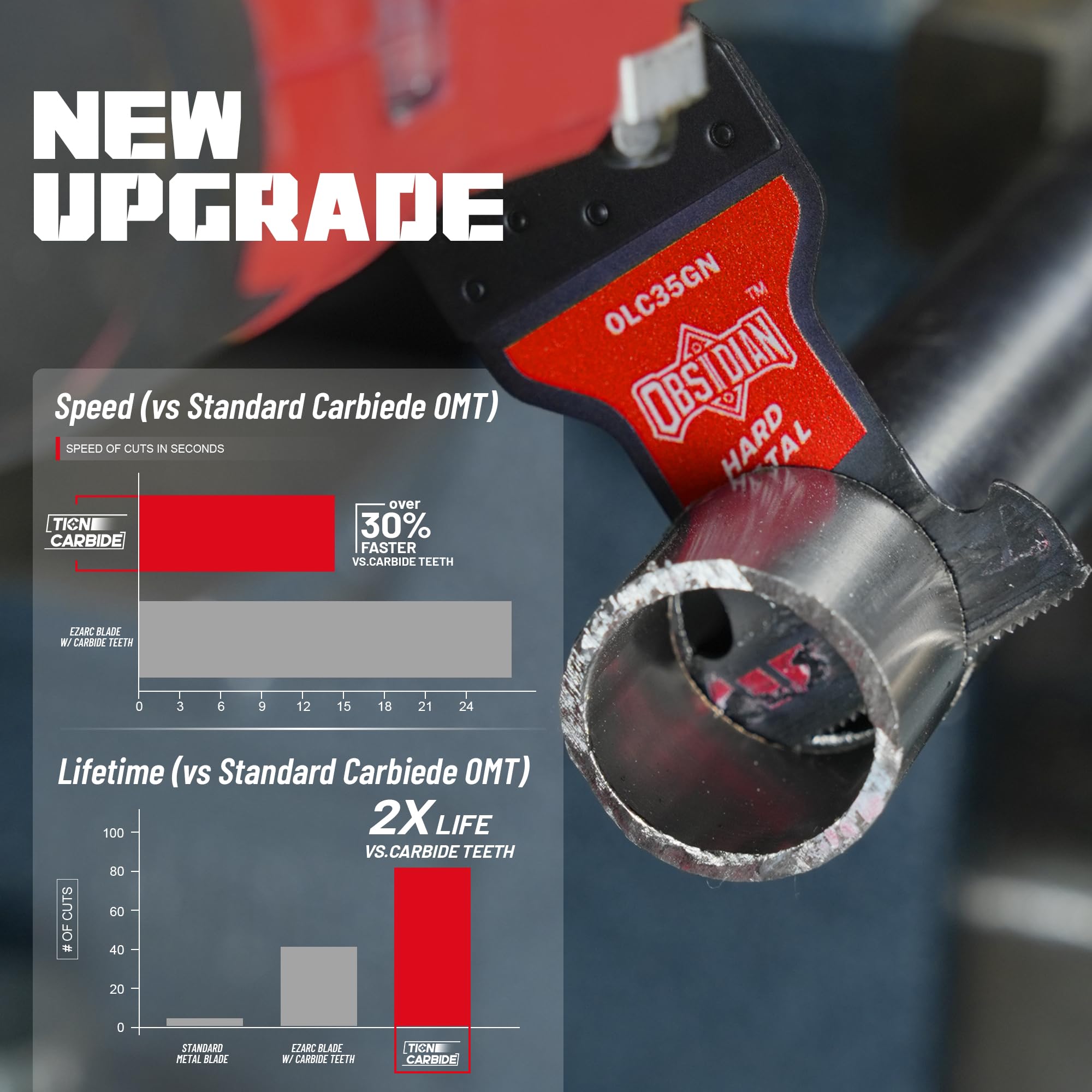 【New! TiCN Coating】Newly released, EZARC OBSIDIAN CARBIDE oscillating tool blade. Enhanced with advanced Titanium Carbo-Nitride (TiCN) coating technology, it features an optimized carbide blend and precise tooth design, delivering sharper edges, faster cutting, and exceptional durability.