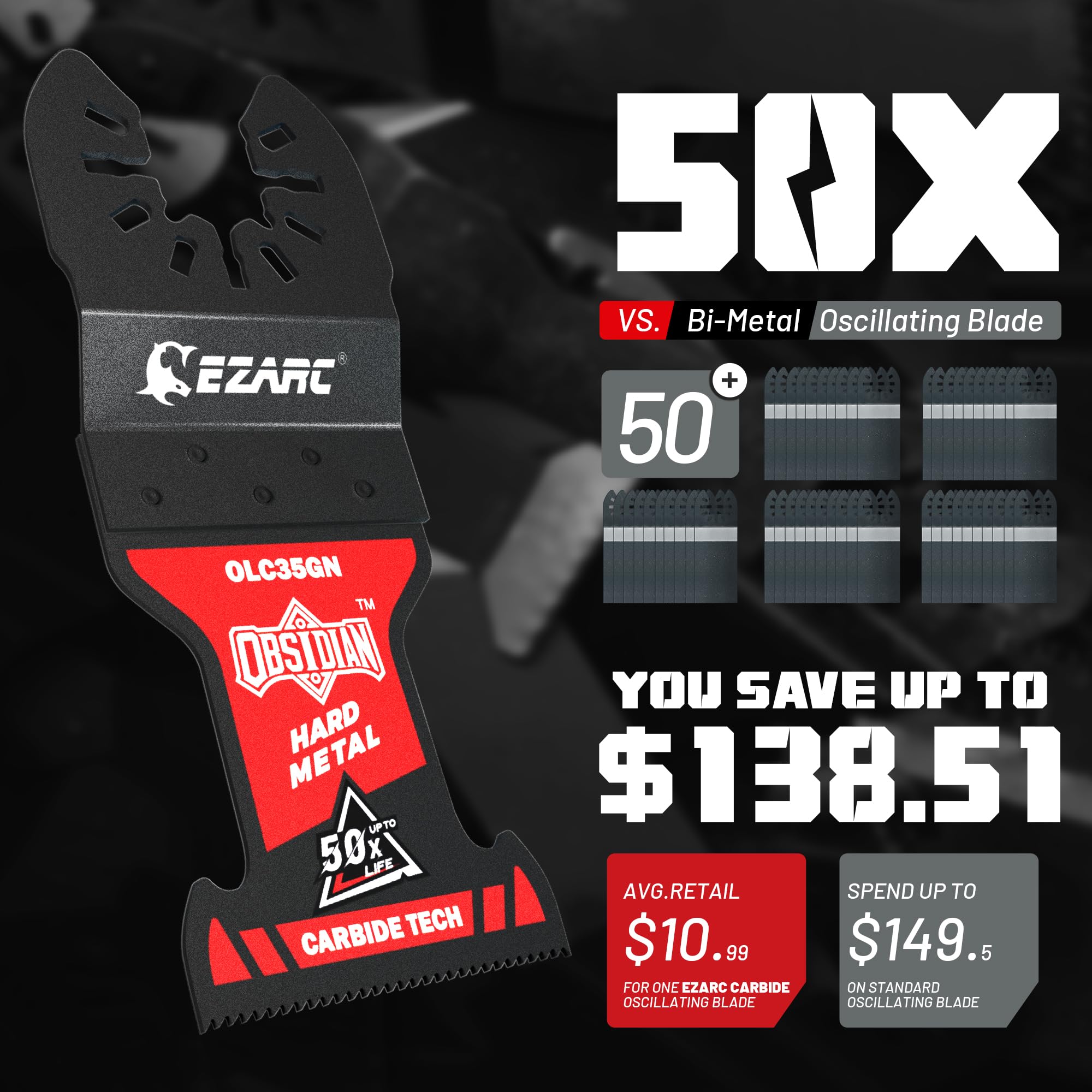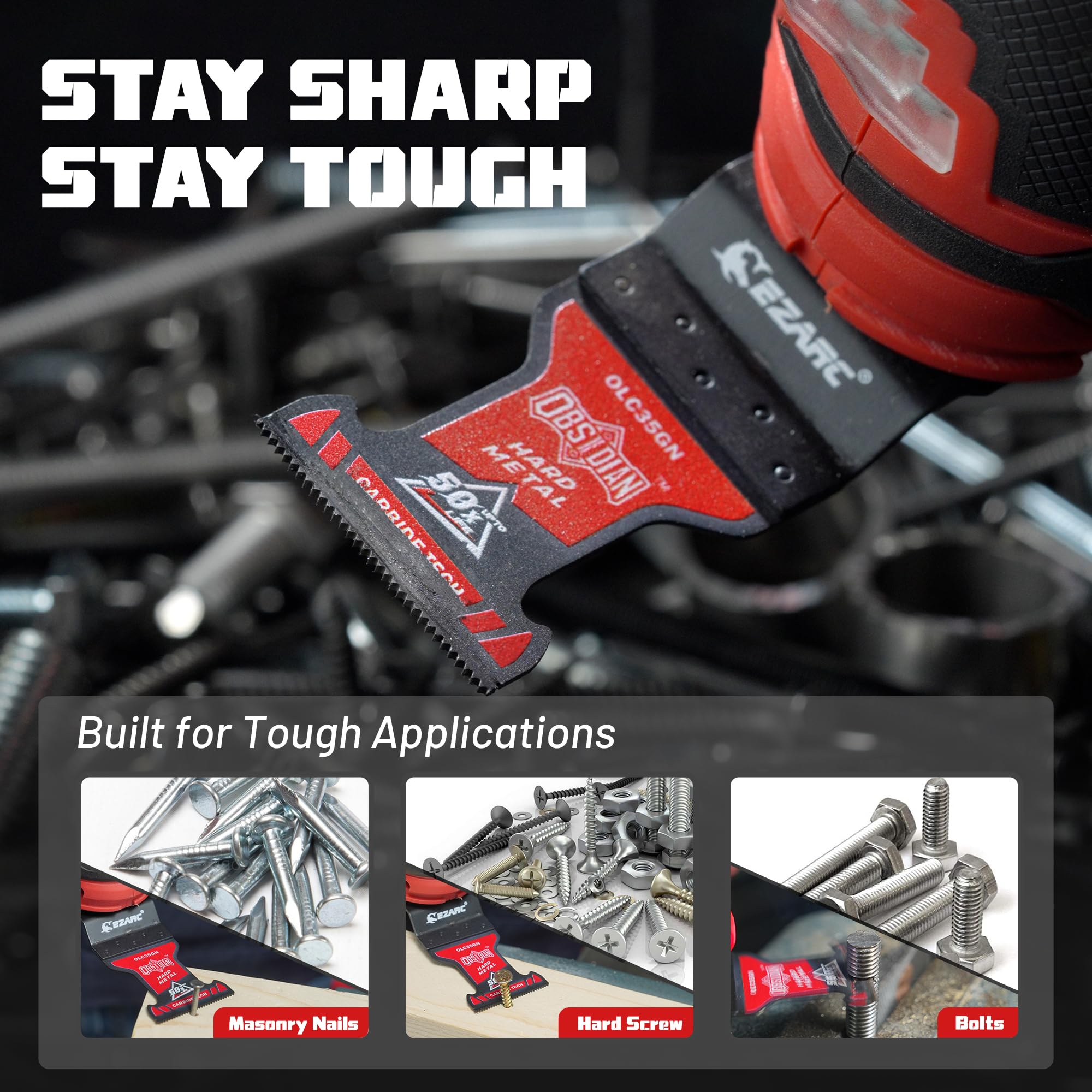 【50X Longer Life】EZARC carbide oscillating saw blade is designed for heavy metal cutting applications like masonry nails, thick metal, screws, wood & nails, bolts, rebar, copper pipe. Lasts up to 50x longer than standard bi-metal multi tool blades.