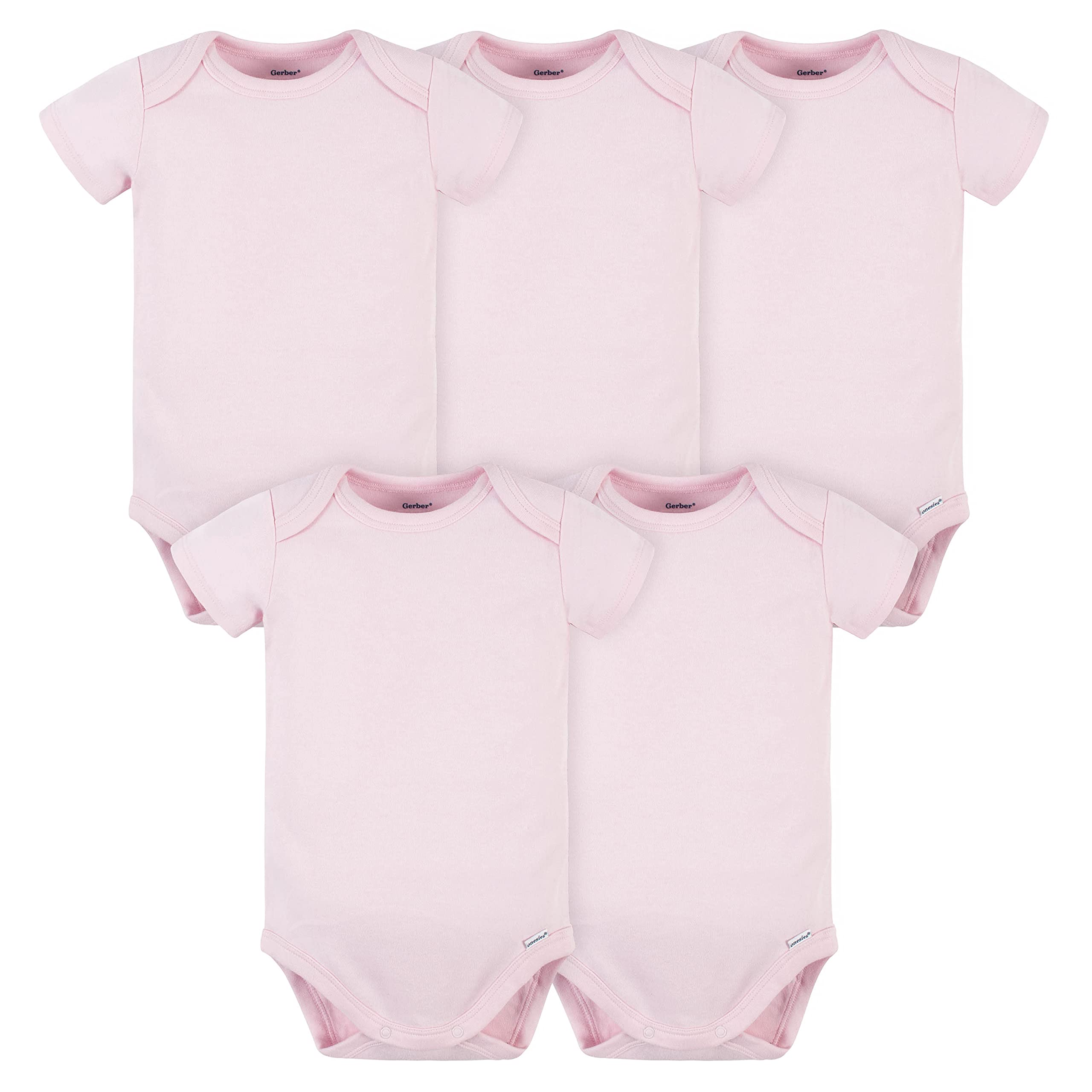 Includes five solid, short sleeve Onesies Brand bodysuits