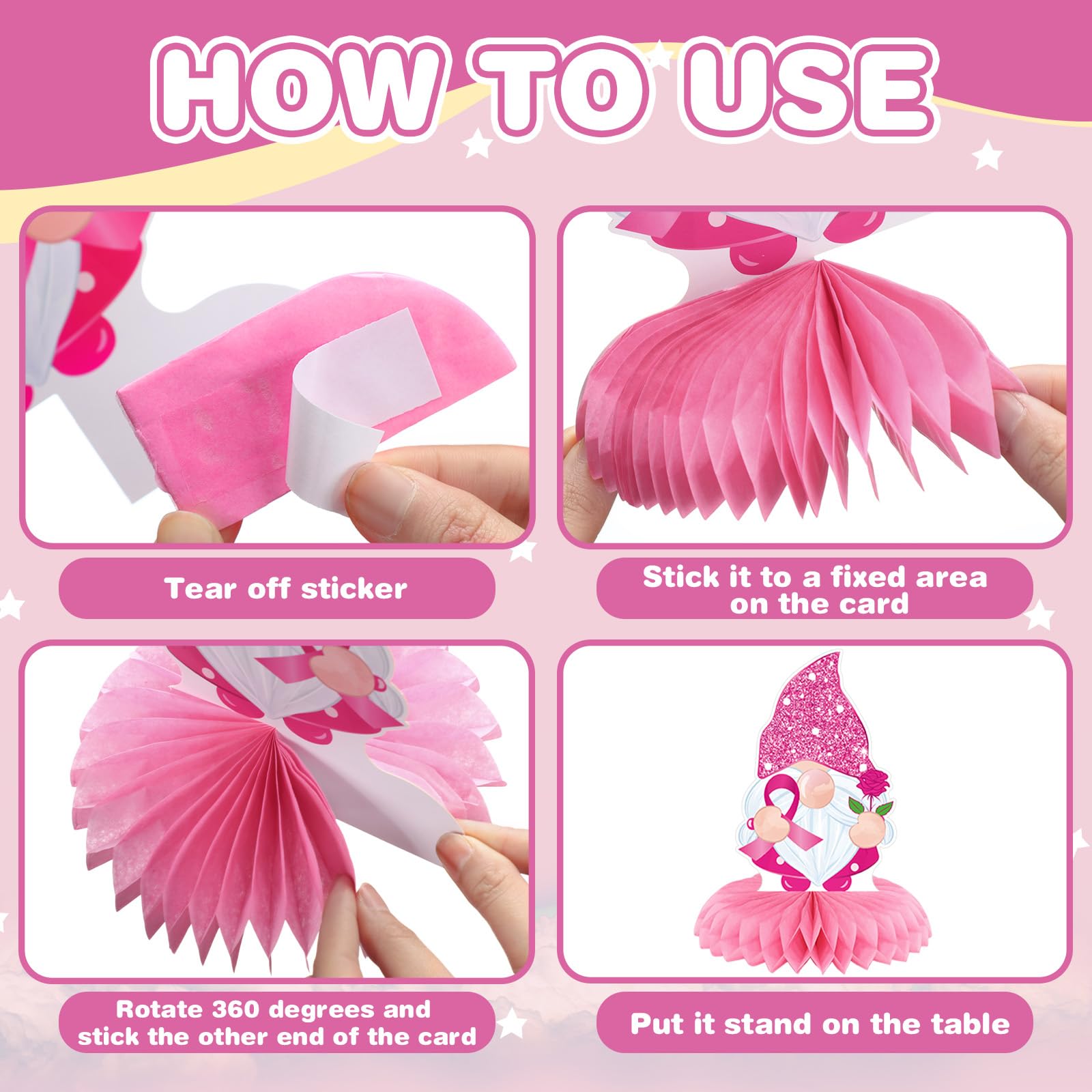 Easy to Assembly: first, you need to tear the sticker down the pink honeycomb table decoration, then put it on the fixed area of the card, put a honeycomb ball on the other side of the card, and finally assemble a honeycomb ornament