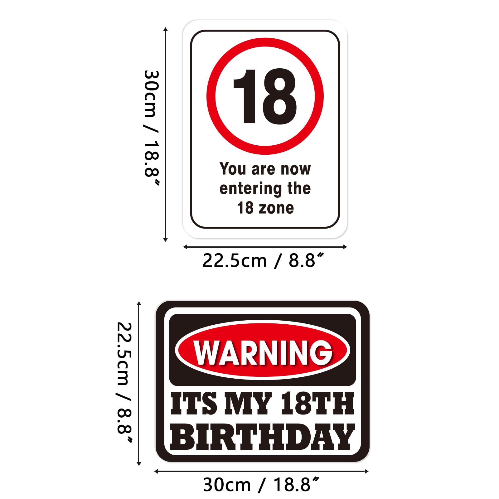 PACKAGE - 9 PCS dirty 18 birthday party supplies. All logos measure 11.8" X 8.8". Total 9 patterns: WARNING: 18th birthday party, CAUTION: 18 YEARS OLD, 18 ZONE ENDS, You are now entering the 18 zone and more.