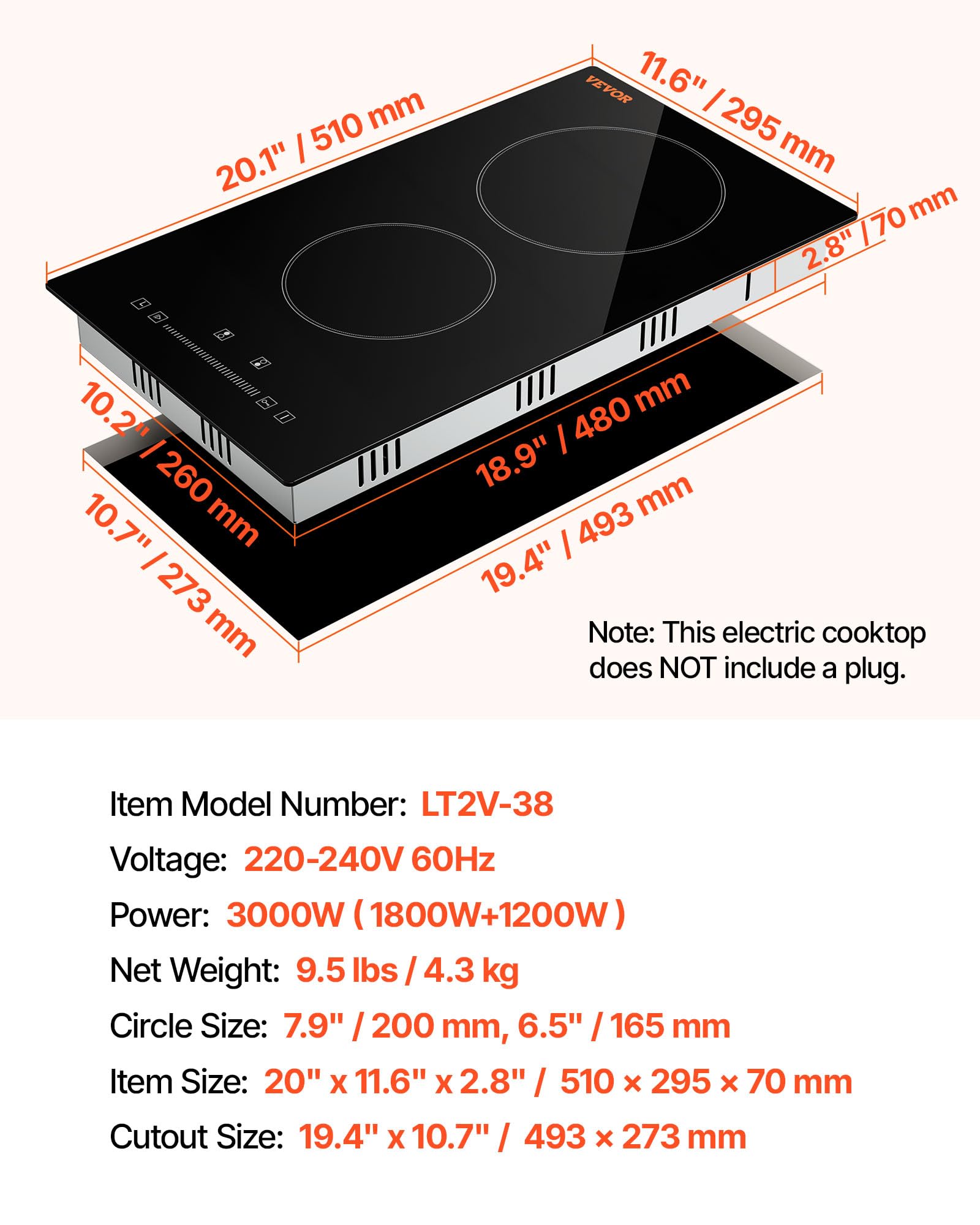 Built-in Design: With the 10.7x19.4-inch cutout size, this 11.6x20 inch cooktop adopts a built-in design, convenient for you to install and saves your kitchen space. Suitable for voltages of 220-240V, 50/60Hz.