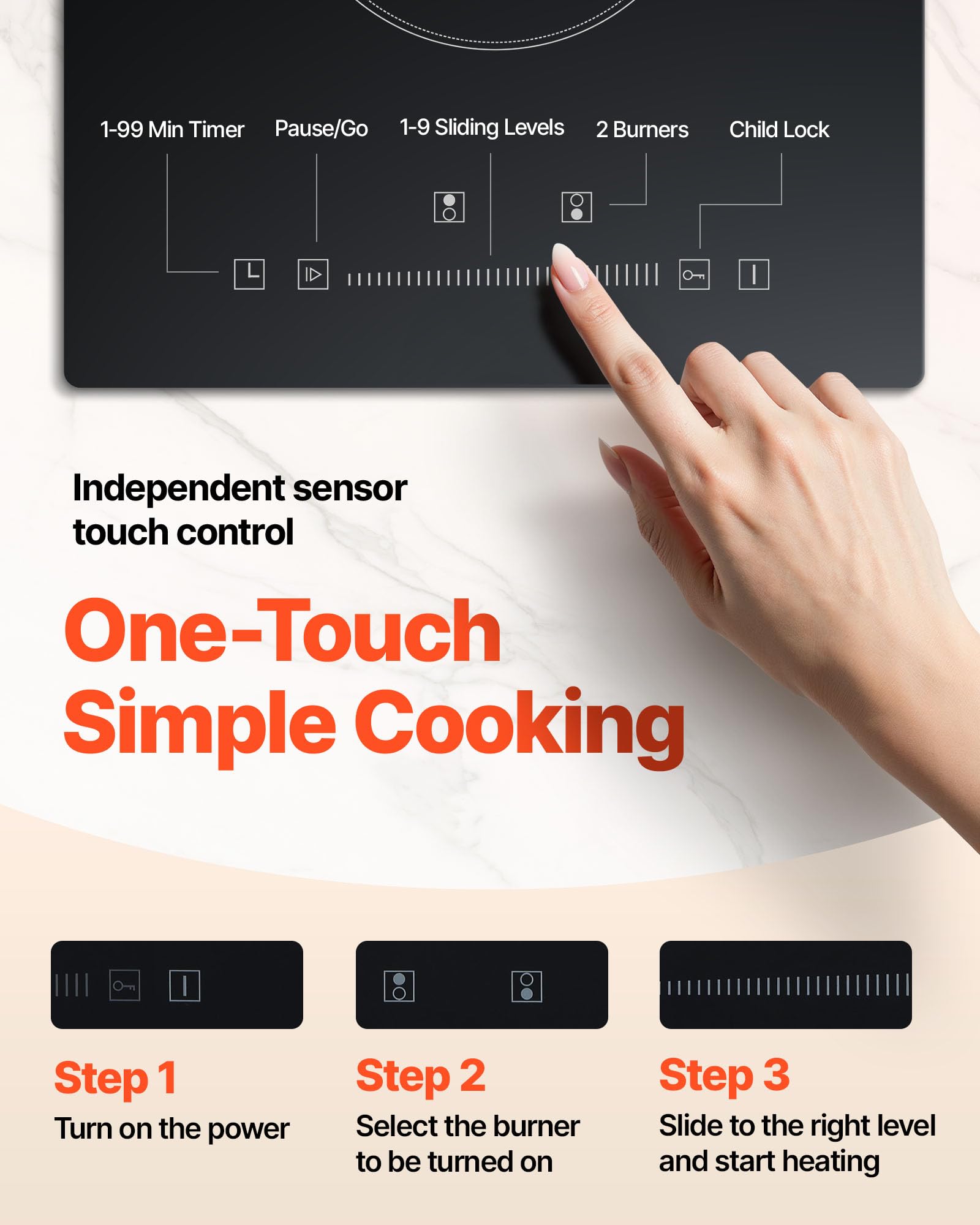 Digital Sensor Touch Controls: Our built-in electric stovetop has 9 heating power levels. With a temperature control, it allows you to precisely switch into different levels from boil to simmer. In addition, the 1-99min timer is equipped, making cooking easy and enjoyable. Set the power and timer and let the cooktop do the rest. This sensor touch control panel is ideal for achieving accurate cooking effects.