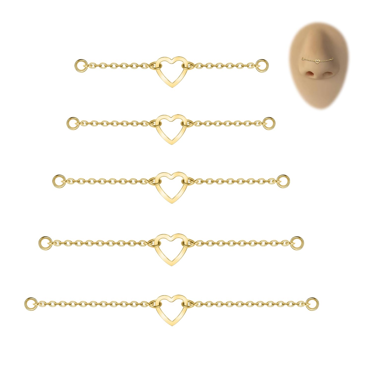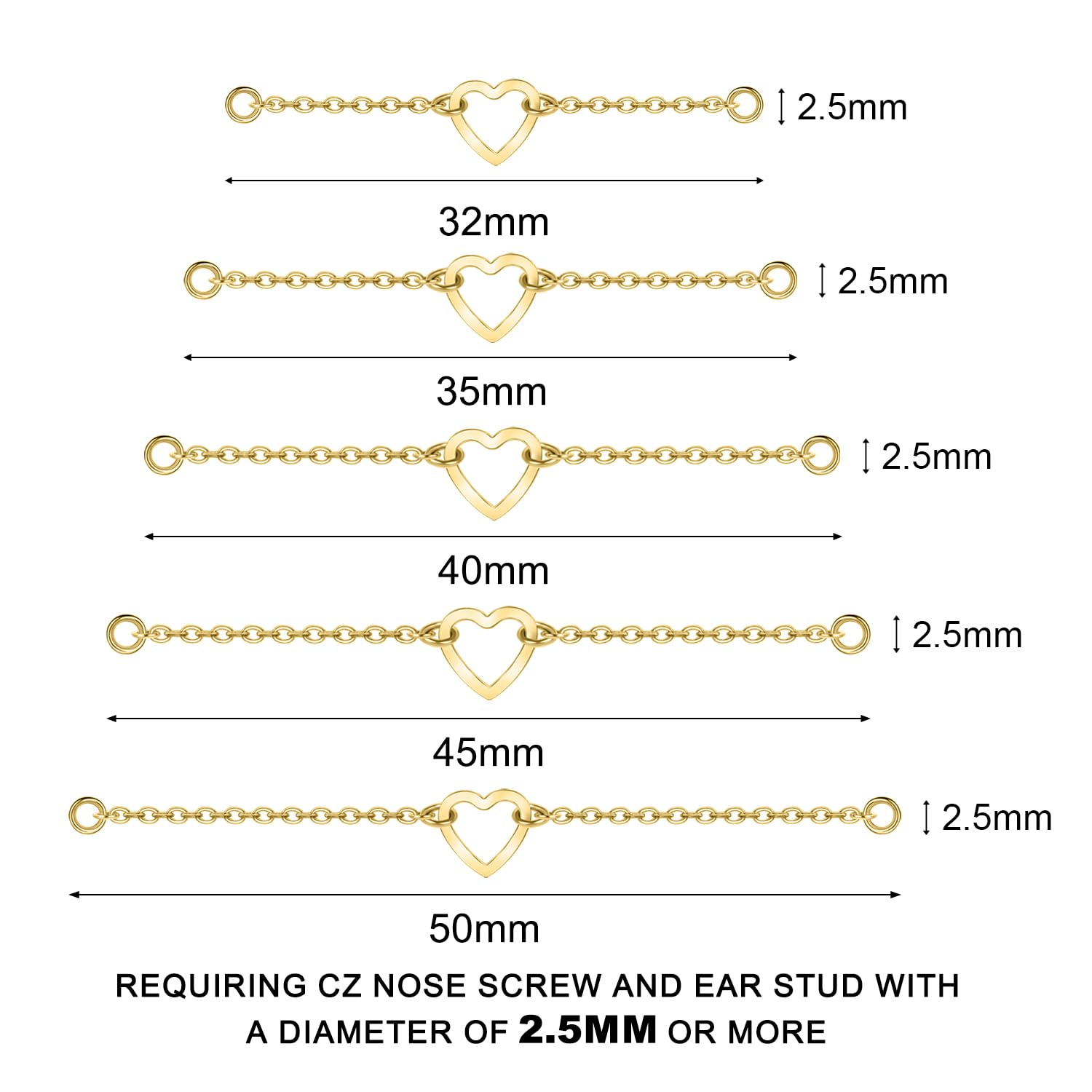 ★Packaging & Size: Five different sizes of nose ring chains, 32mm, 35mm, 40mm, 45mm, 50mm, meet your wearing needs for different parts. The position of the nose chain buckle requires CZ nose nails and ear nails with a diameter of 2.5mm or more. (This set does not include nose studs, nose rings, or earrings)