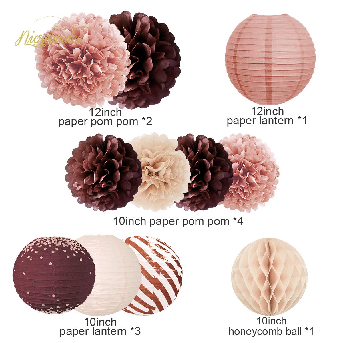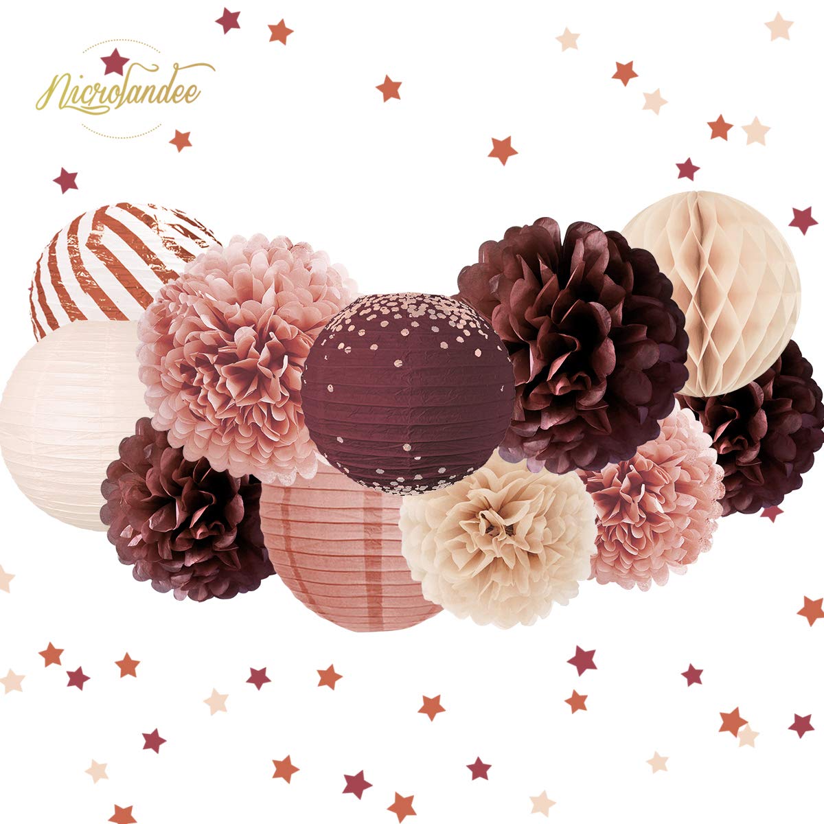 Elegant Burgundy Party Package Includes: Cinnamon rose party decorations kit come with 12pcs decorative accessories. 4pcs different size hanging paper lanterns, 6pcs different size paper pom poms, 1pc paper honeycomb ball and 1pc 50g table confetti. *LED lights not included