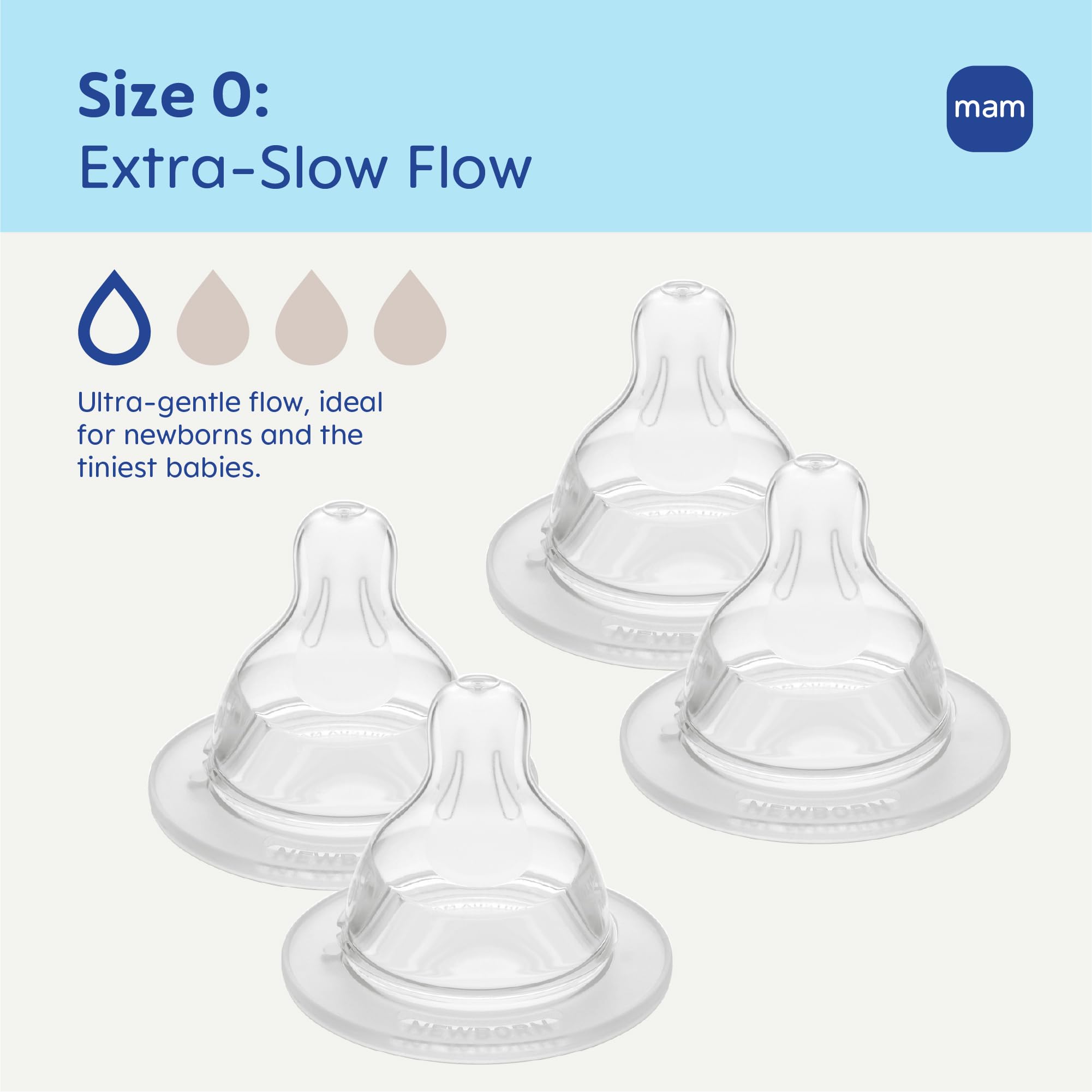 MAM's nipples are lovingly designed to resemble a mother's nipple during breastfeeding. To achieve this, MAM observed infants breastfeeding using ultrasound technology. The result is a unique flat symmetrical shaped nipple that fits perfectly in baby's mouth and makes the switch back-and-forth between breast and bottle easy. All MAM nipples are made from silicon that is free from BPA materials for maximum safety. These nipples fit all MAM bottles and are suitable for both breast milk and formula. The MAM nipple is available in five different flow rates: 0 – extra slow flow (newborn), 1 - slow flow (0+ months), 2 - medium flow (2+ months), 3 - fast flow (4+ months), and x - extra fast flow for thicker liquids (6+ months). MAM nipples are proudly made in Europe.