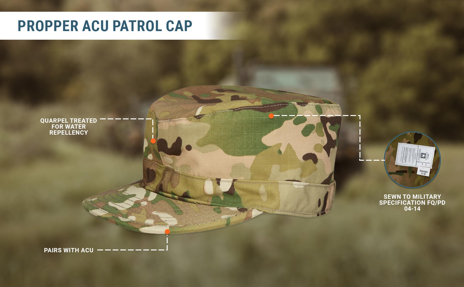 Description The Propper ACU Patrol Cap, featuring genuine AR 670-1 approved Scorpion 2 OCP camo, is the ideal match for your ACUs. This authentic military cap is crafted to specification FQ/PD 04-14, using 50% nylon / 50% cotton Quarpel treated water repellent ripstop.