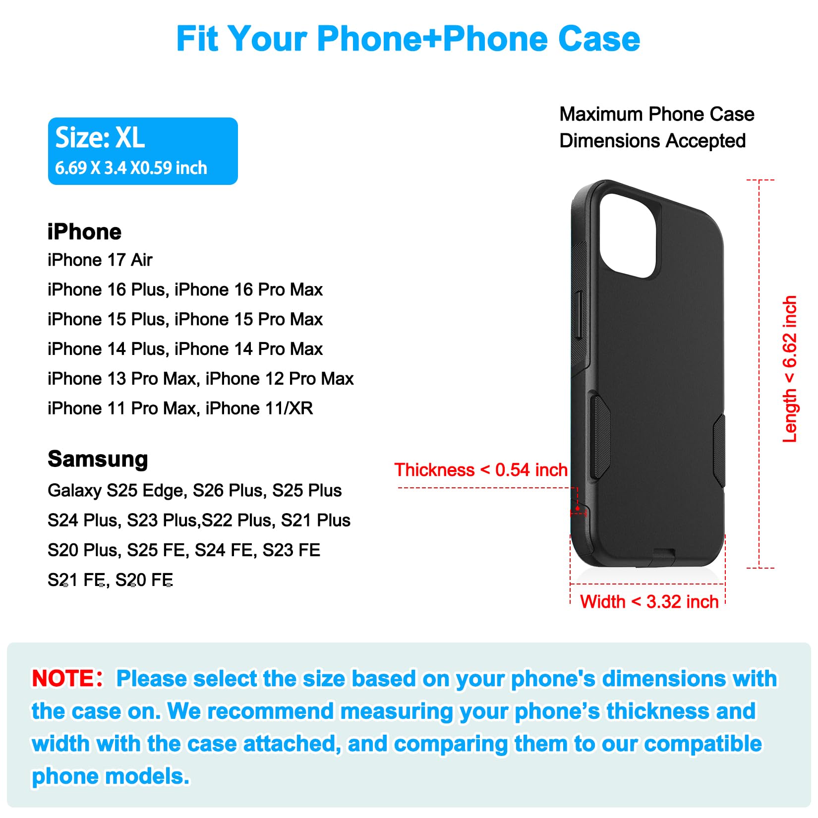 Choose from three sizes: L - 6.29x3.05 x0.59 inches, XL - 6.69x3.14x0.59 inches and XXL - 6.88x3.34x0.59 inches for a perfect fit with your phone