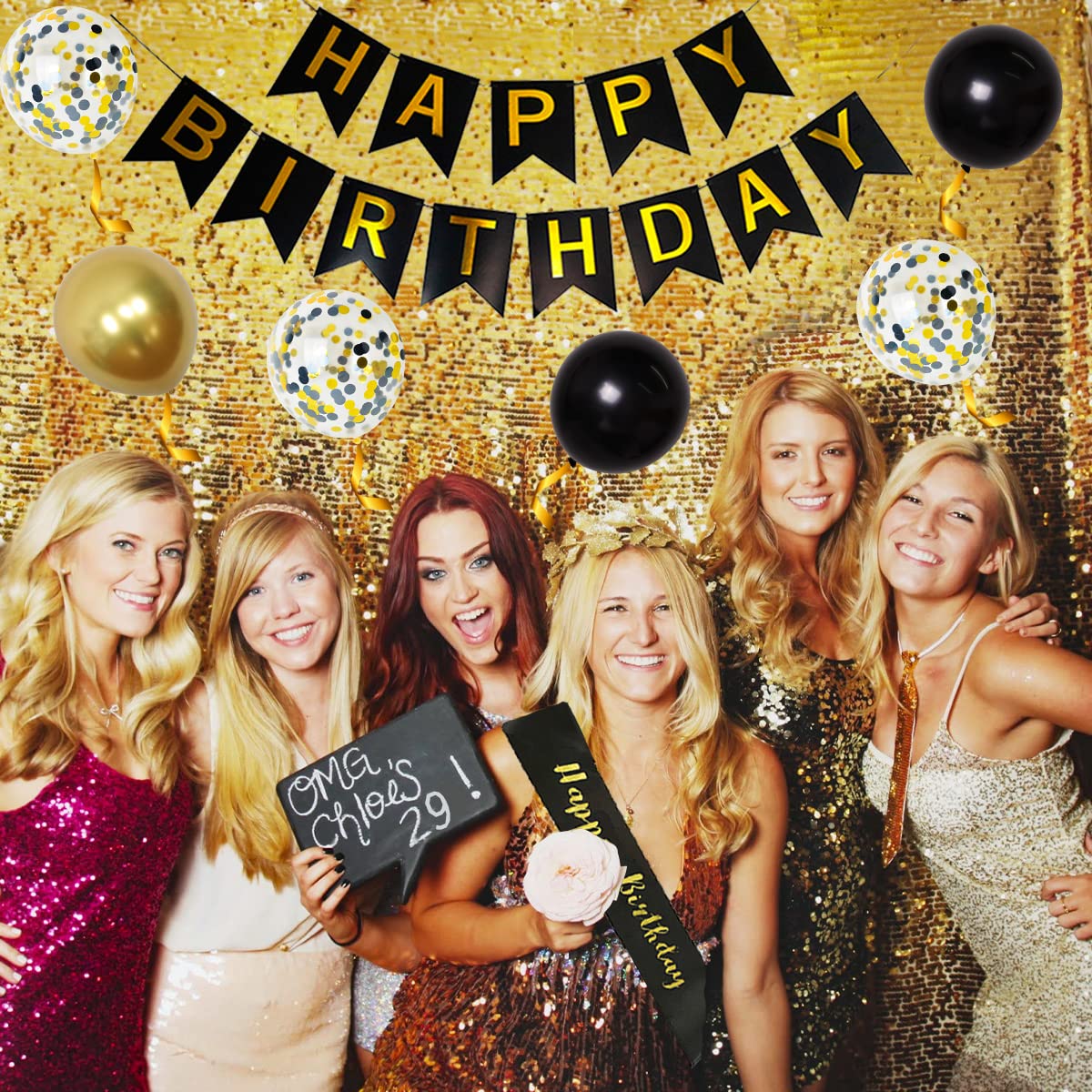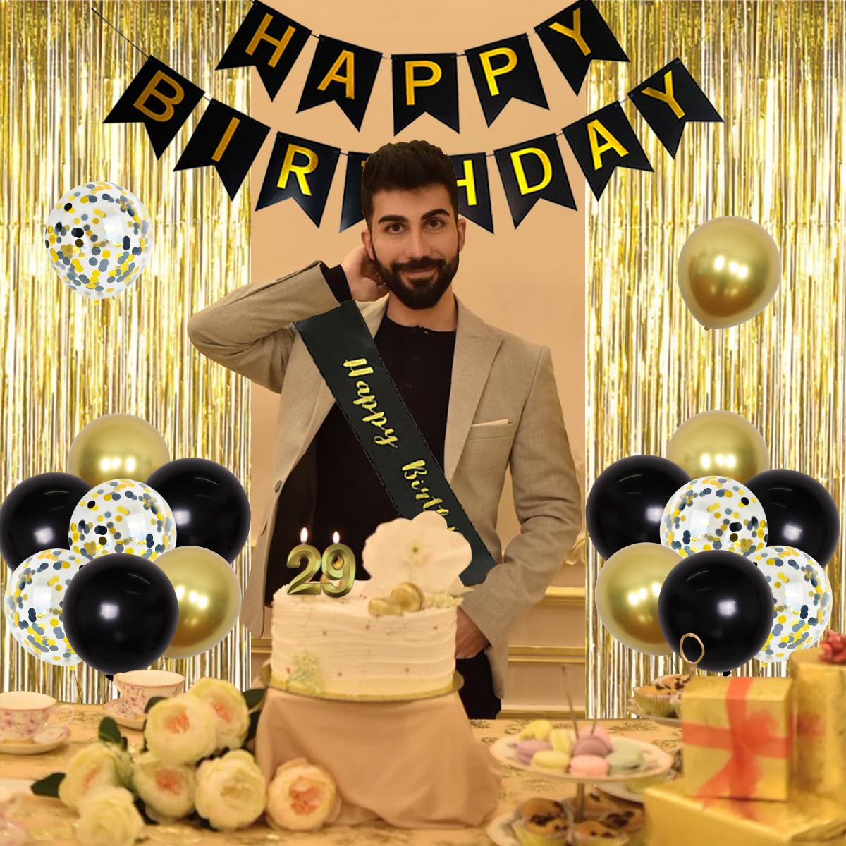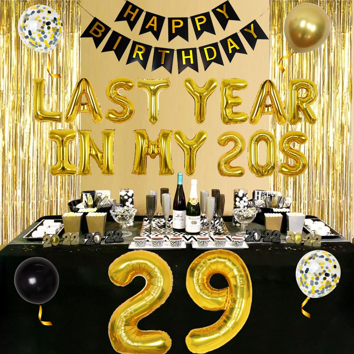 Celebrate your 29th birthday party in style with our gold 29 years old birthday decorations! Gold 29th Birthday Decorations: 15 x latex balloons - 12 inches(5 black, 5 metallic gold, 5 confetti) 1 x Last Year in My 20s foil balloons - 16 inches(No Helium Supported) 1 x number 29 foil balloon - 40 inches (gold) 1 x Happy Birthday banner 1 x Happy Birthday sash 1 x gold tinsel curtain 3.2*6.5ft