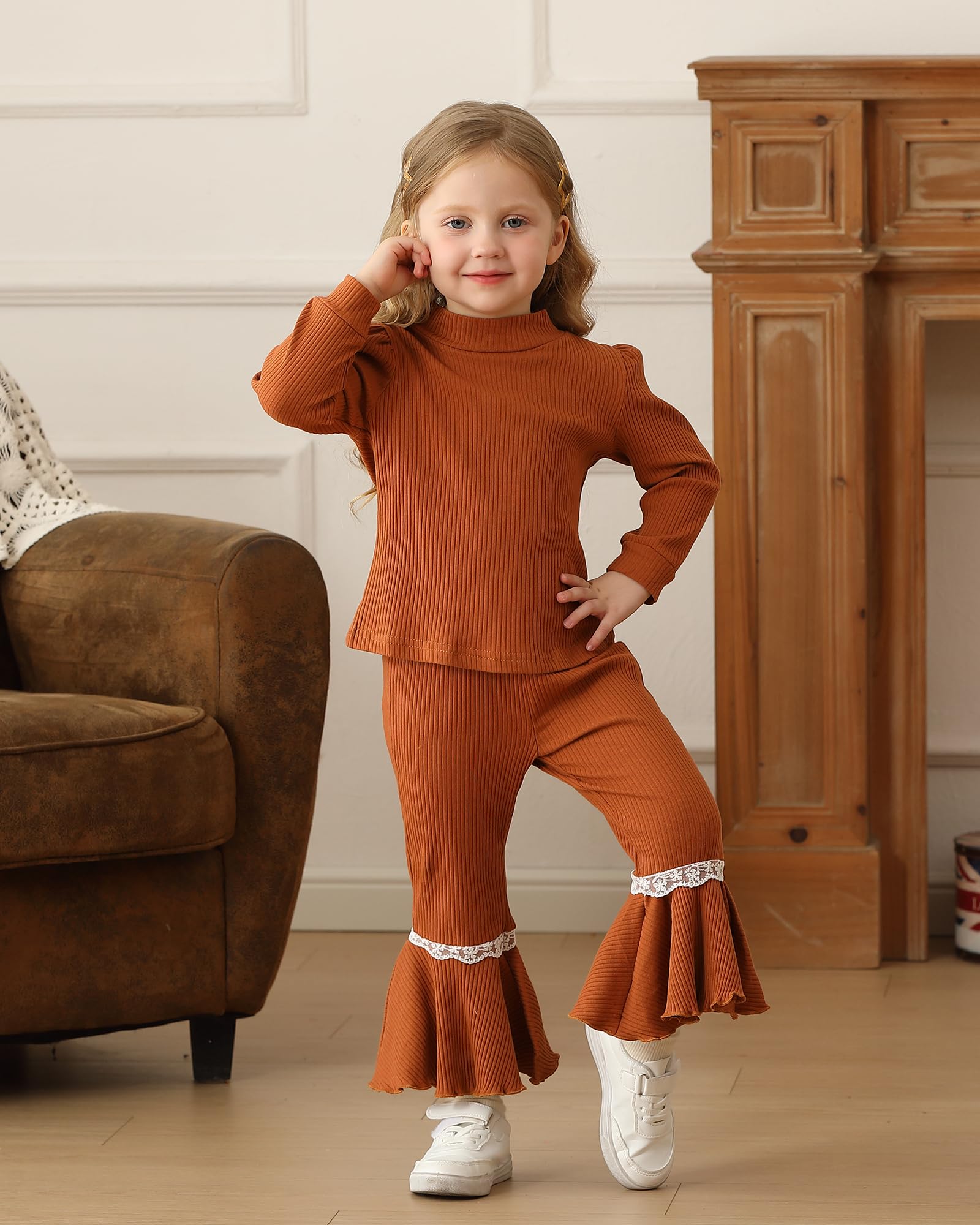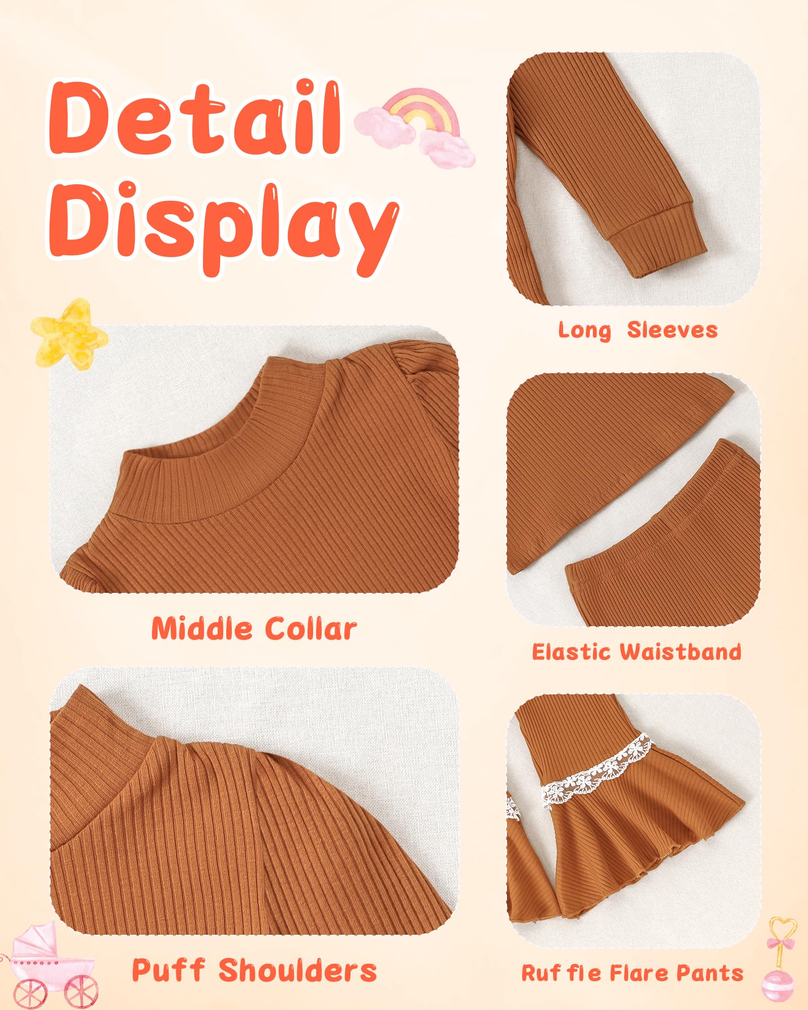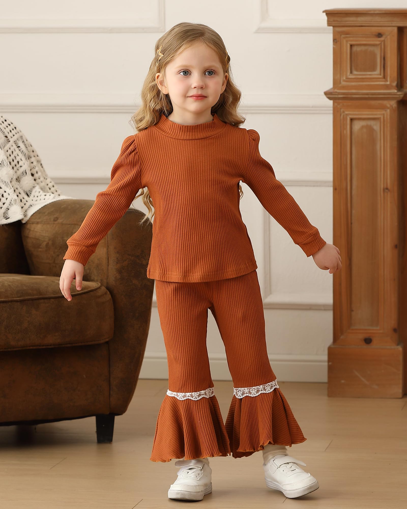 Designs: Baby girl 2 piece pant sets feature the ruffled shoulder, a headband and girls pant with pockets, pullover long sleeve shirts tops, solid color.