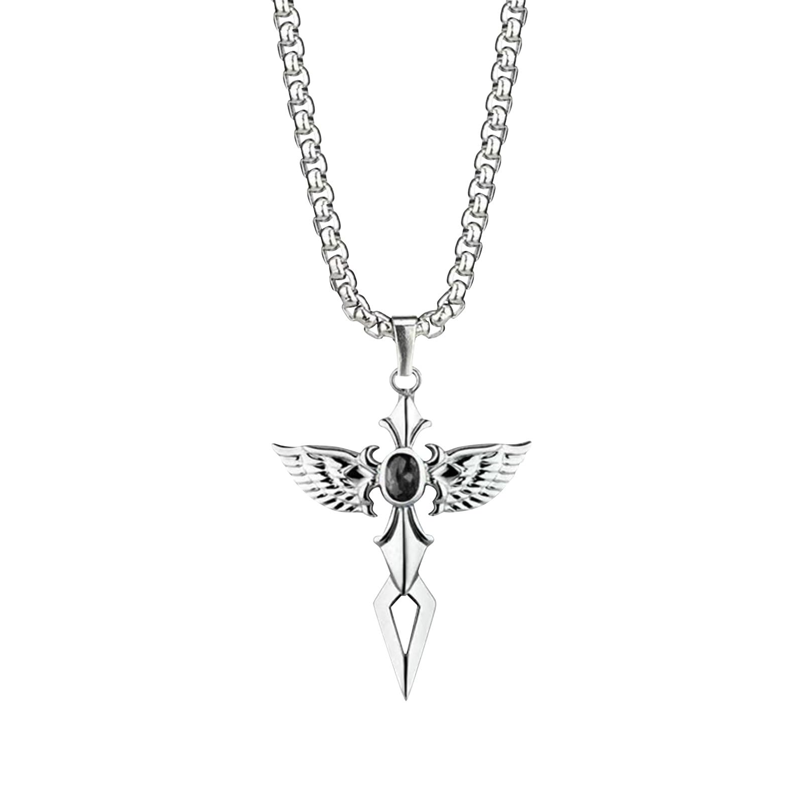 Silvertone pendant of a large, ornate cross on bail loop, with black glass stone center. hangs off of a matching chain.