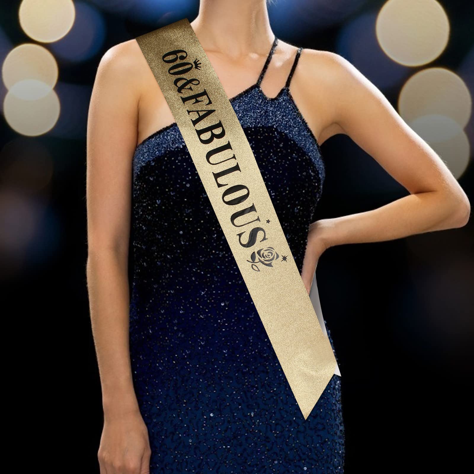 Gold Birthday Sash: Made from high quality glitter fabric and printed with black foil words reads “60 & FABULOUS”.Elegant and gorgeous!The sash is in 61 inch length and 3.7 inch width,and comes with a pretty pin.
