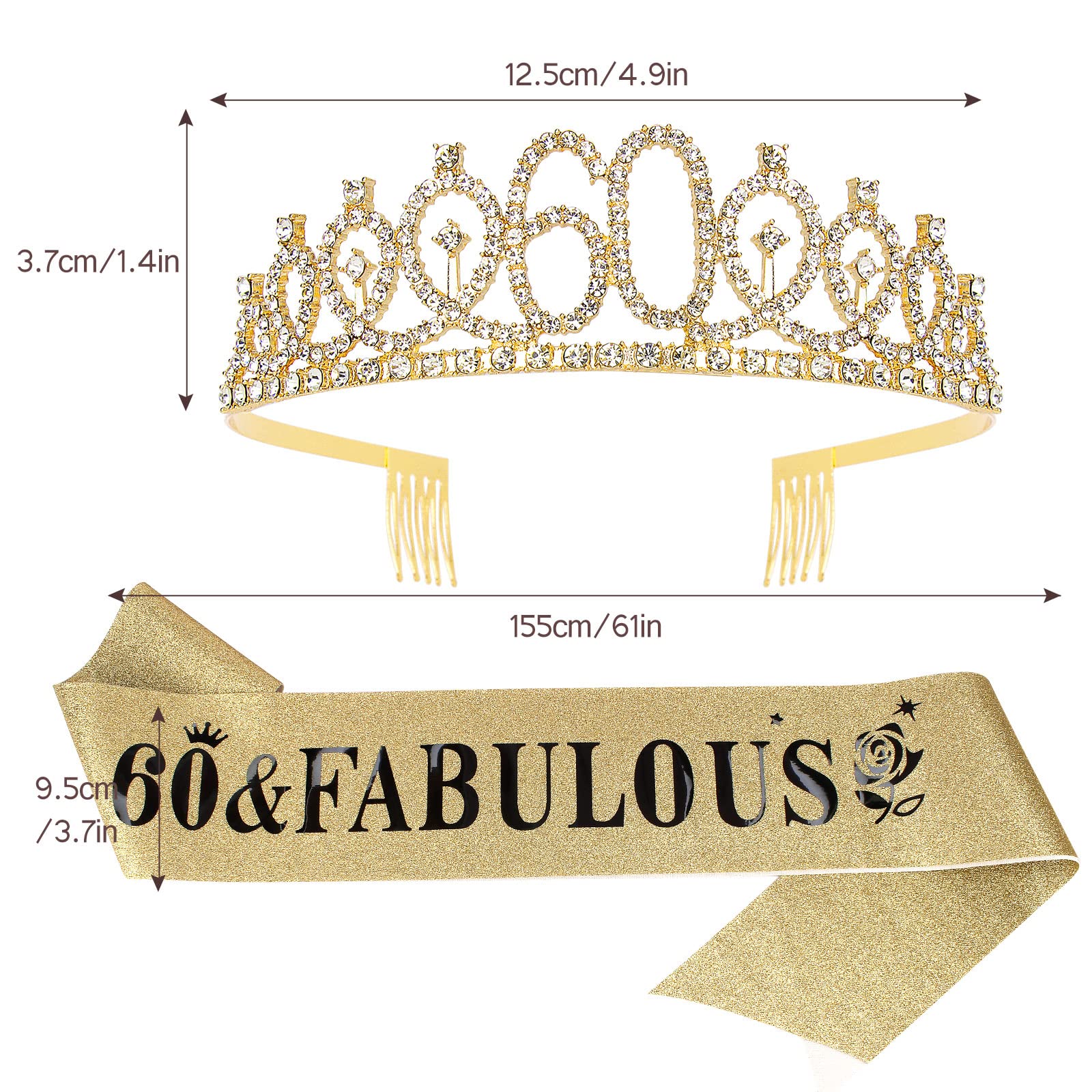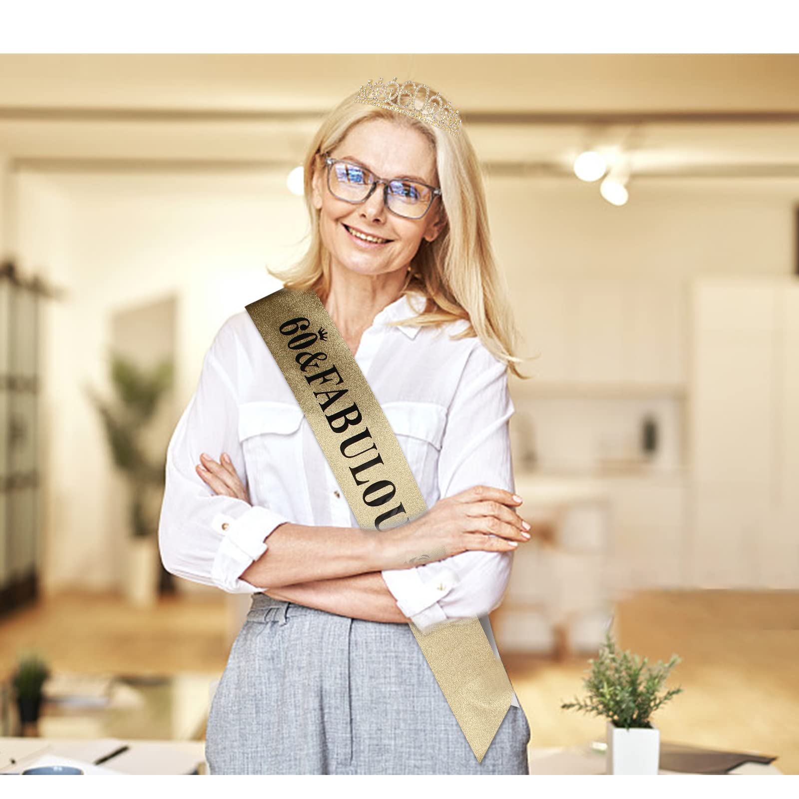 The Perfect Birthday Party Set :“60 & FABULOUS” birthday sash and 60-year-old gold tiara.