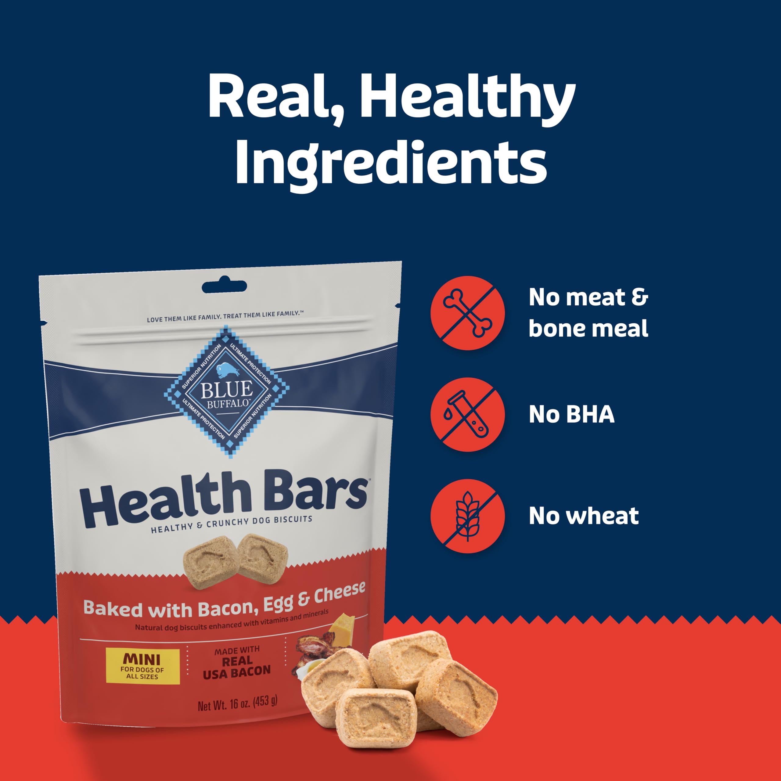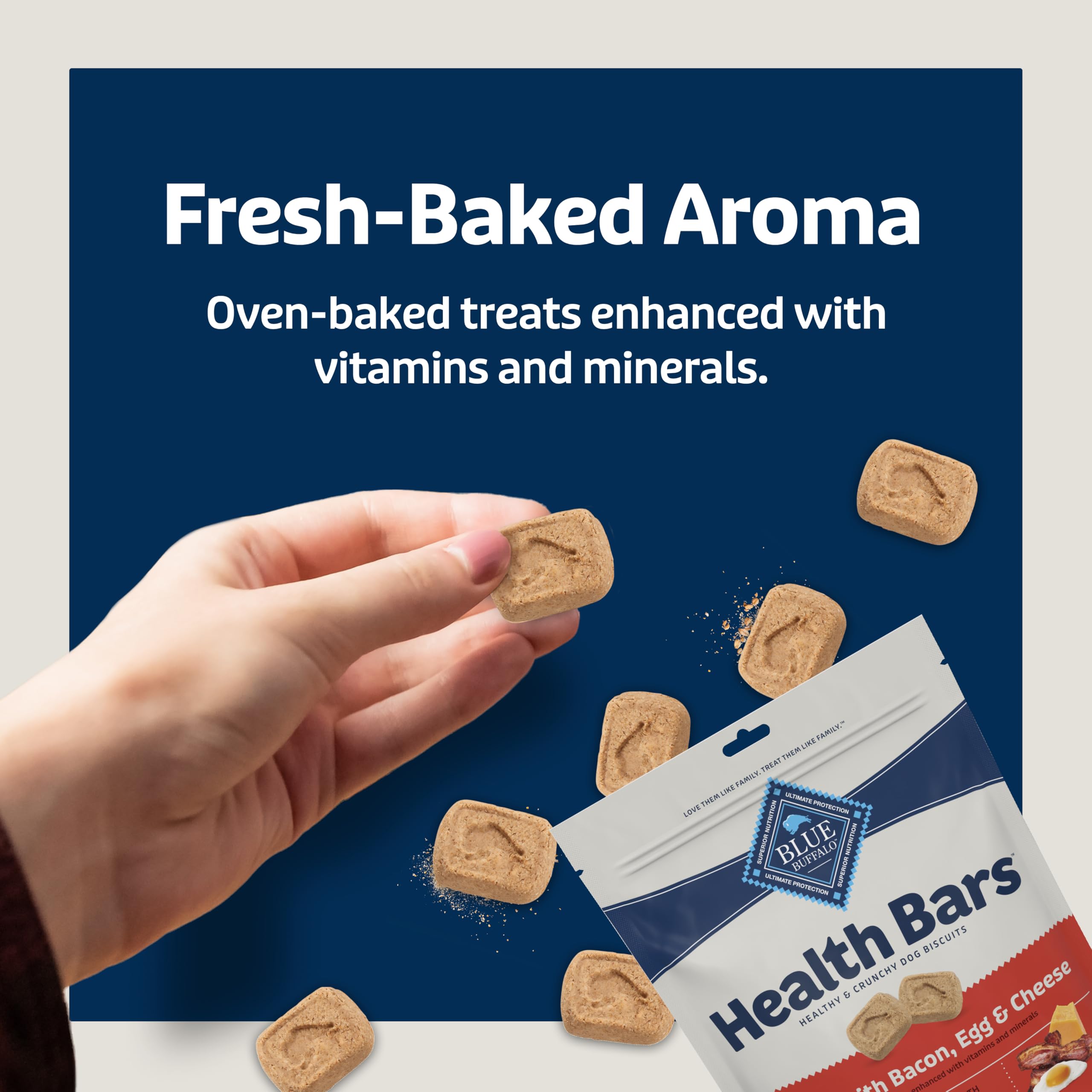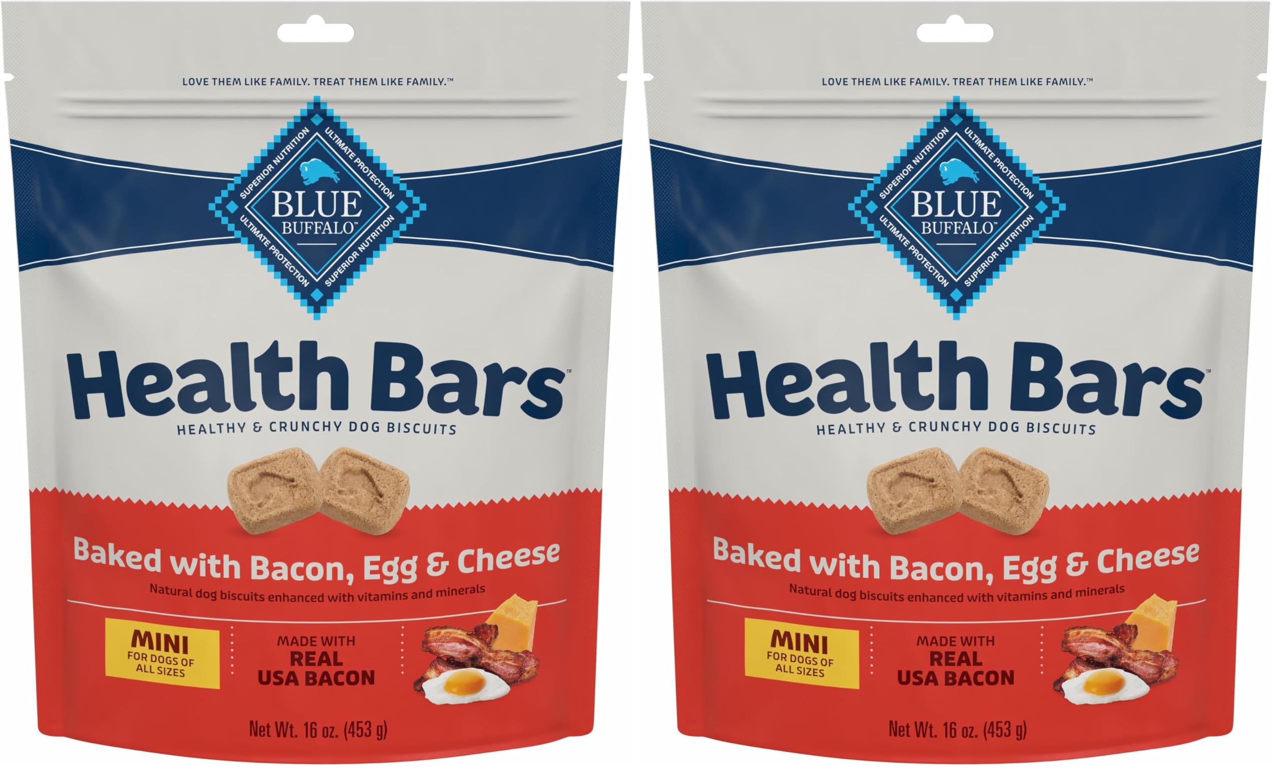 INCLUDED IN PACKAGE: Contains one (1) 16-oz bag of BLUE Health Bars Mini Crunchy Dog Biscuits, Oven-Baked with Natural Ingredients, Bacon, Egg & Cheese