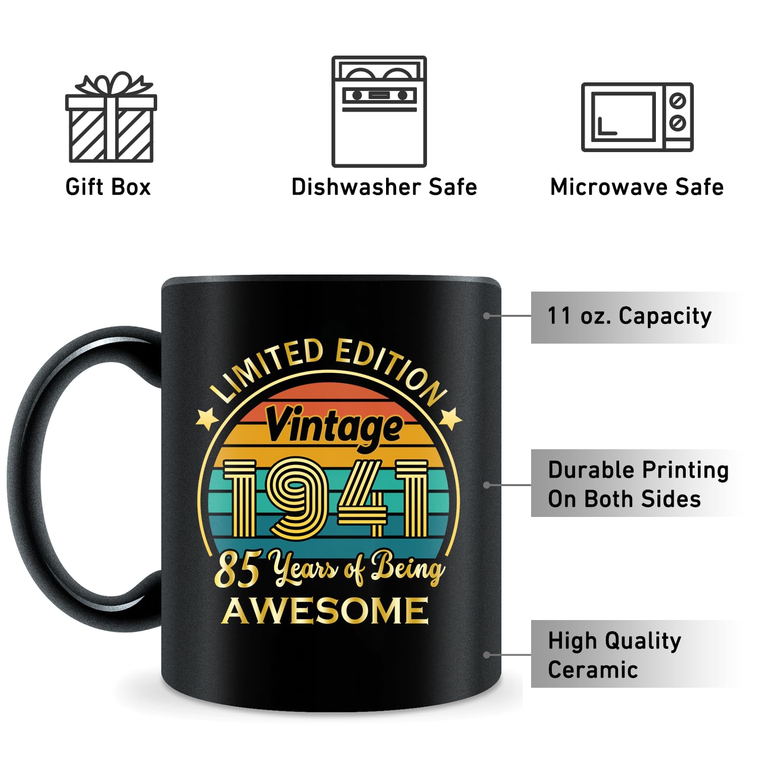 Nostalgic Design: Featuring a stylish and timeless design, this mug highlights the significance of the year 1941. Ideal for those who appreciate a touch of nostalgia, it's a unique and thoughtful gift that stands out from the ordinary.