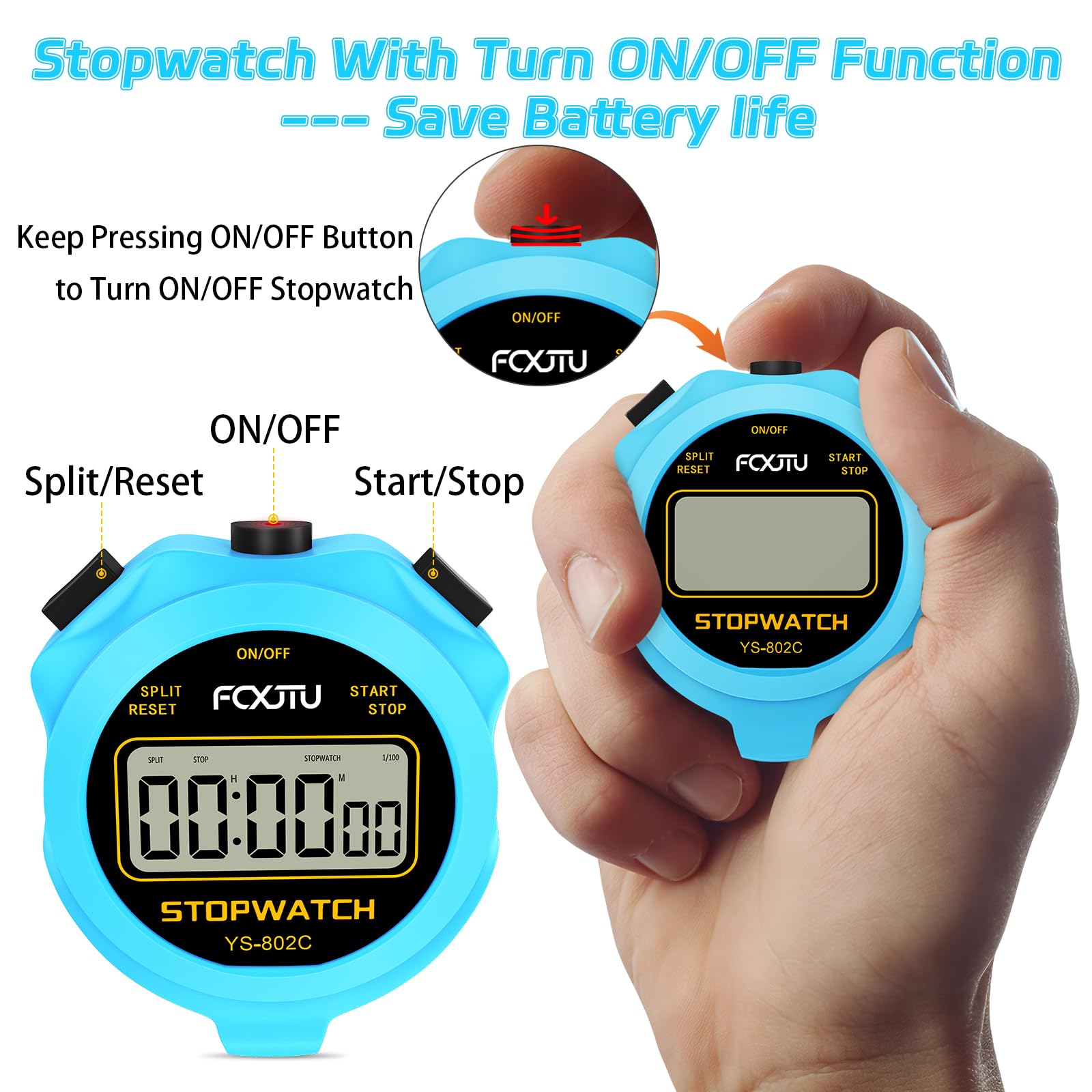 ON/OFF WITH BATTERY: The Stop watch has on/off function with one LR44 battery. Hold on the ON/OFF button 5 seconds to turn it on/off