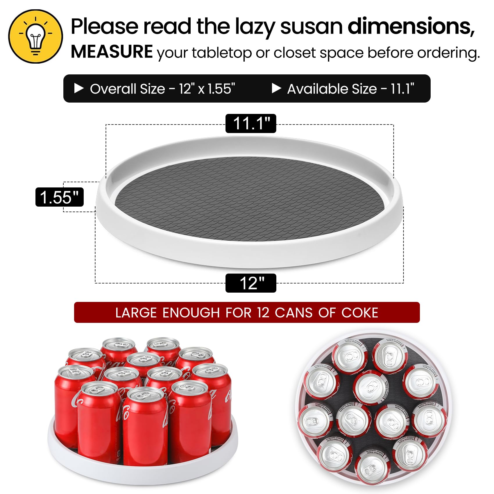 [ Please Note ] - The lazy susan is large enough for 12 cans of coke (refer to the 2rd image). Please read the lazy susan dimensions and measure your tabletop or closet space before ordering in case it doesn't fit. Overall Size - 12" x 1.55". Available Size - 11.1"