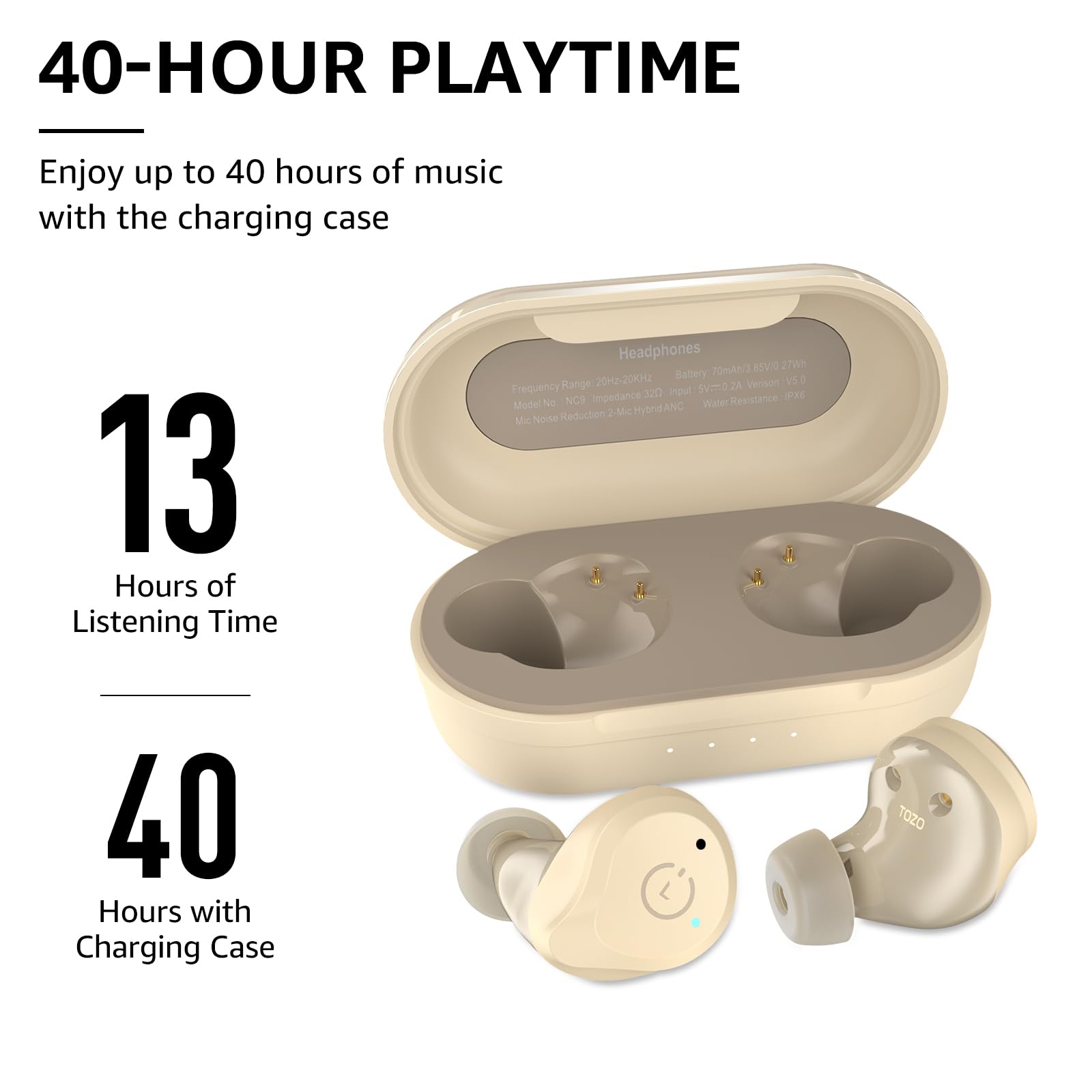 【Charge on the Go】TOZO NC9 wireless earbuds can last for over 13 hours' playtime from a single charge and 27 extra hours in the compact charging case. In the Active Noise Cancellation mode can last for over 7 hours' play time. Providing convenient charging way with no strings attached.