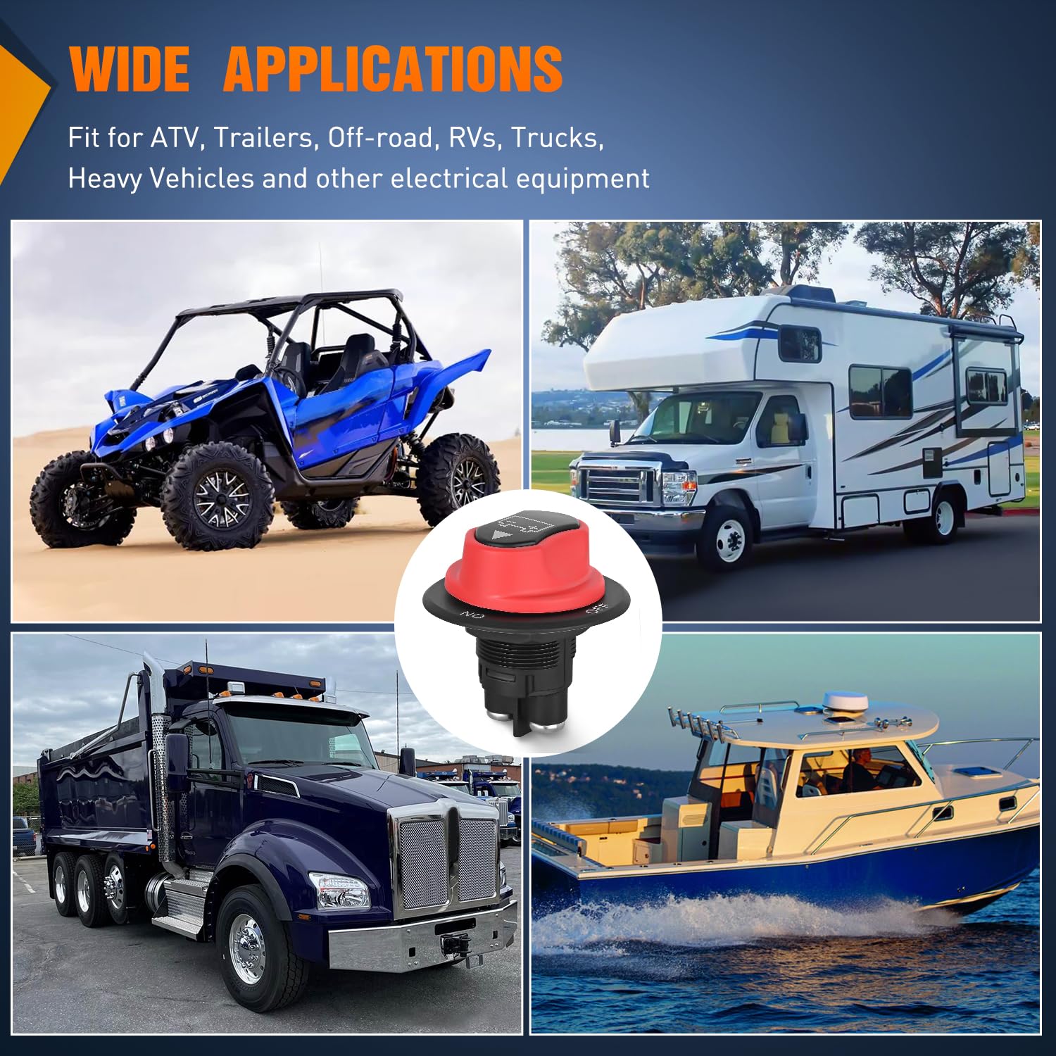 Compatible: used for 12 - 48VDC systems to isolate and secure the electrical system, can stand alone or be locked together with other switch.Widely used for cars, marine boats, RVs, campers, travel trailers, trucks, ATVs, UTVs, battery banks and other devices.