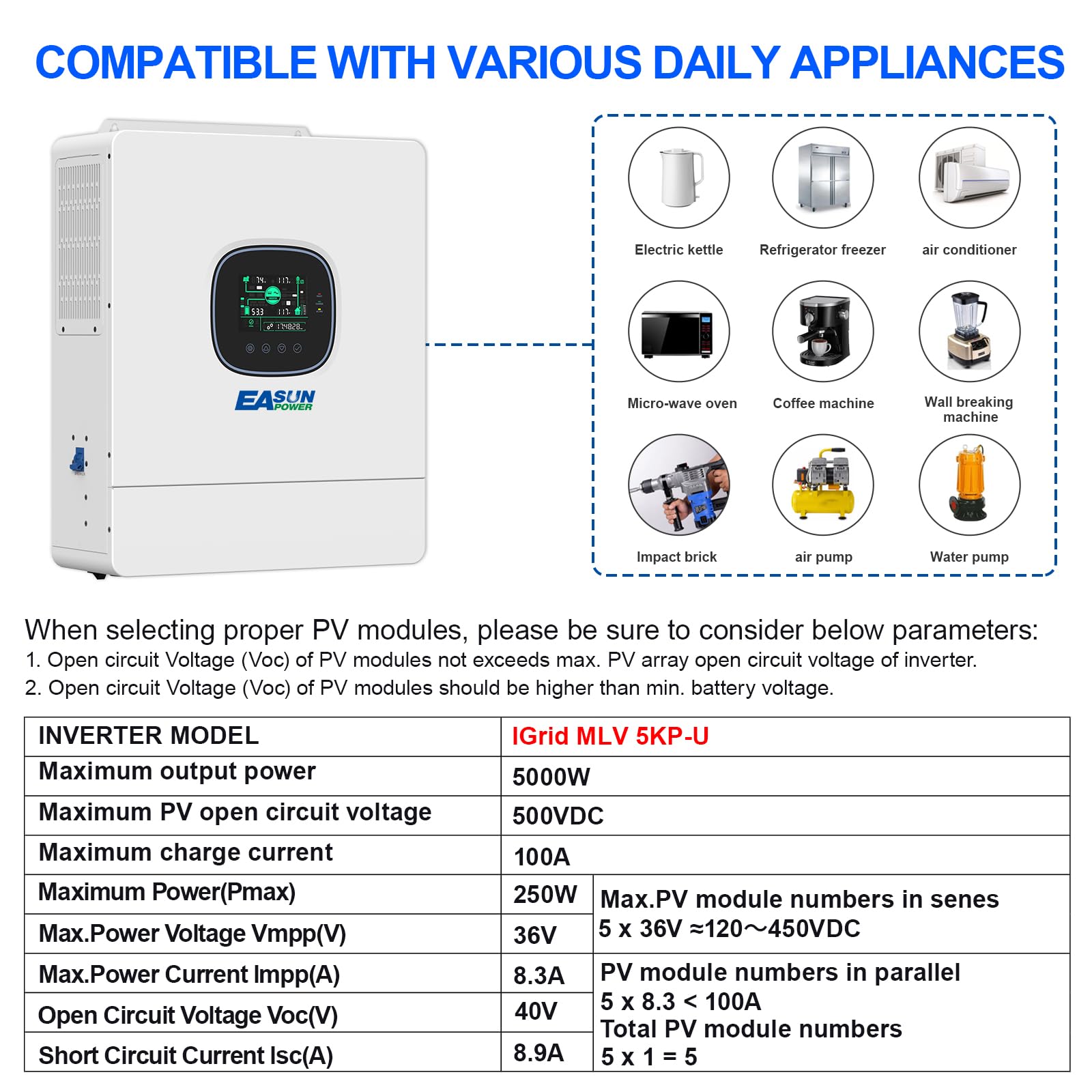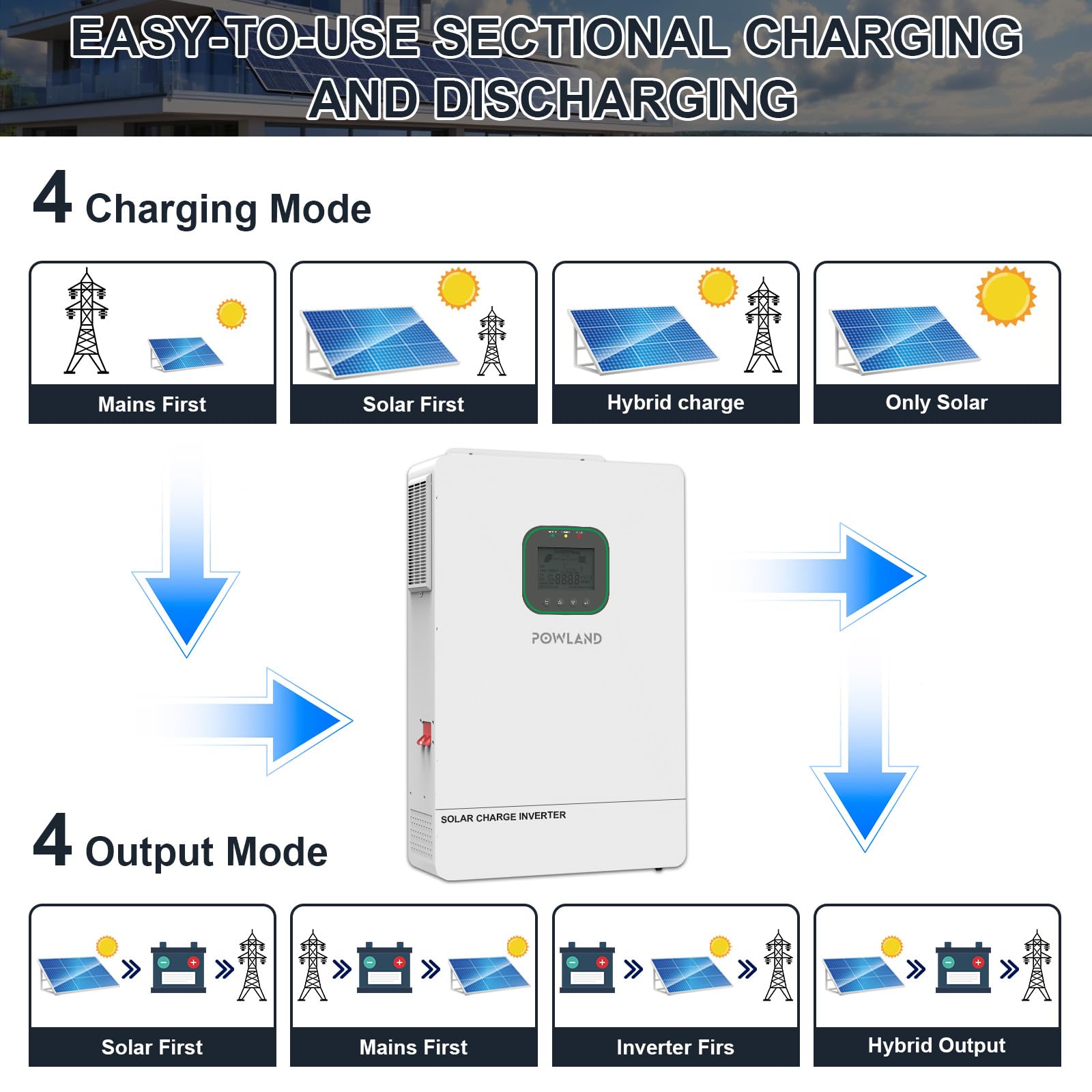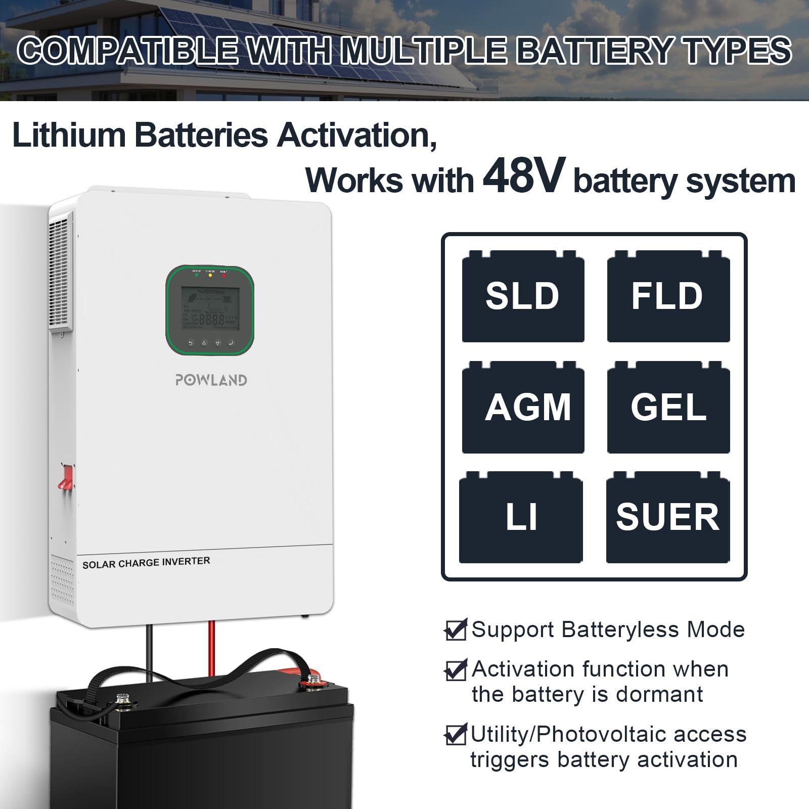 【Enhanced Battery Compatibility & Grid Backup】Works seamlessly with 48V lead-acid and LiFePO4 batteries. Automatically switches to grid or generator power when needed and restarts when AC power resumes. Designed to extend battery life with smart charging control.