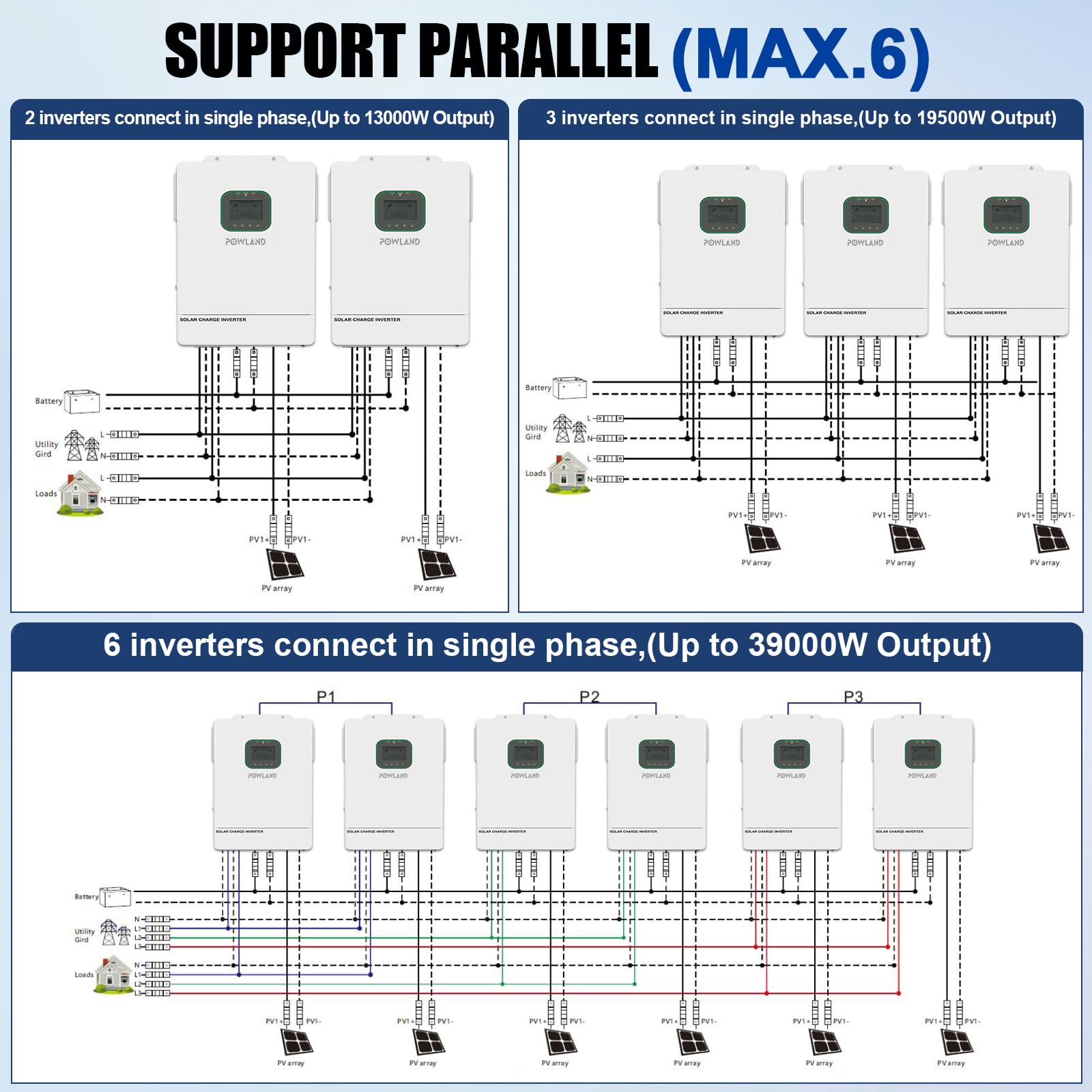 【NEW UPGRADE HYBRID INVERTER】6500W Solar Hybrid Inverter Output Voltage Regulation120Vac±5%, Rated output power : 6500W; Max PV Array Open Circuit Voltage: 300VDC, PV operating voltage range: 120-300Vdc, MPPT voltage range: 90-260Vdc, Max AC Input Voltage: 140Vac,Max PV input current: 22A. The inverter has a WiFi port, which requires the purchase of an additional WiFi device link, and can be remotely monitored via the APP.