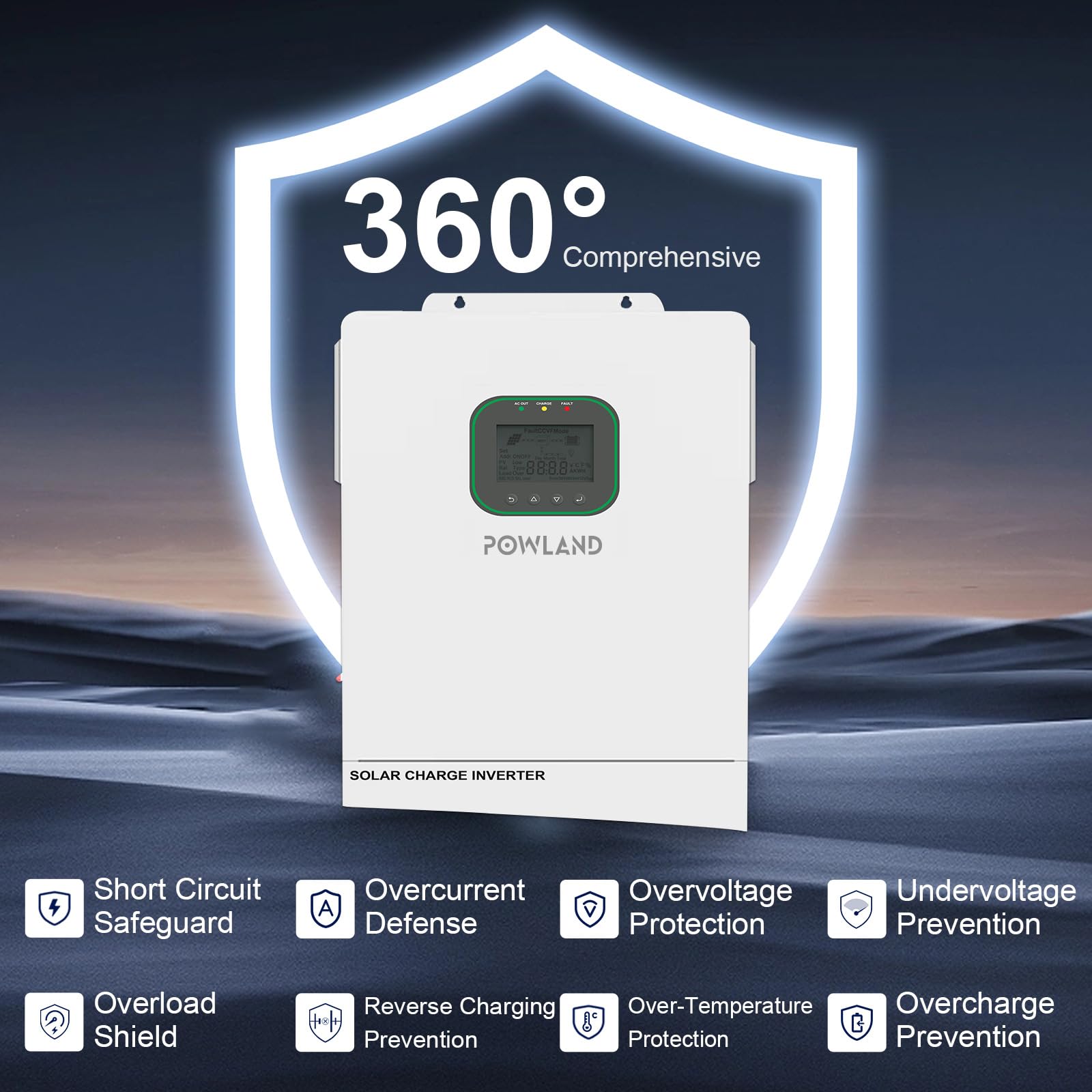 【Intelligent LCD Display & Protections】Real-time monitoring through a user-friendly LCD interface. Advanced safety mechanisms include PV reverse current protection, over-temperature/overload/short-circuit protection, and adaptive cooling fans to maintain safe operating conditions.