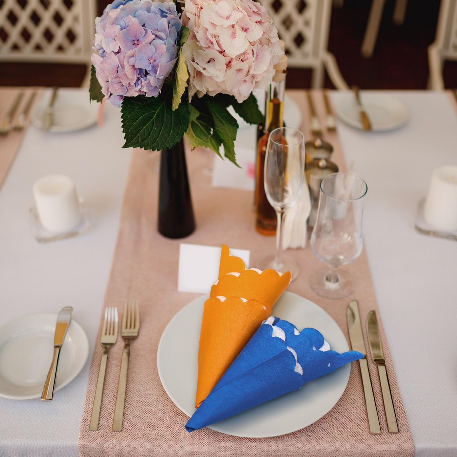 Suitable for Versatile Occasions: be it holidays, baby shower, bridal shower, or a simple dinner party, our boho napkins are a suitable fit; Their classic Orange Blue color and scalloped edge design make them a hit at any celebration or occasion; These baby and bridal shower napkins are not just ideal for dining, but also excellent for table decorations, showcasing a versatile advantage