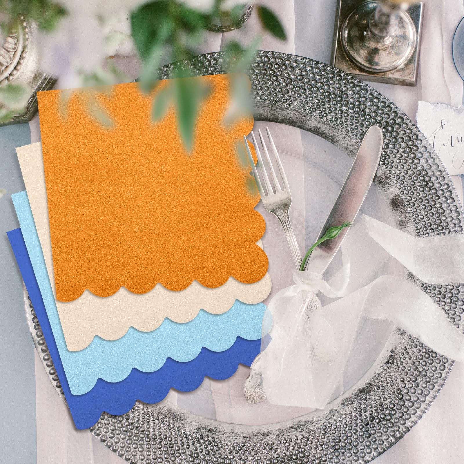 Exceptional Aesthetic Contribution: crafted with a captivating Orange Blue gradient coloration, these scalloped napkins, from light to dark, are not your average table accessory; Their stylish scalloped edges amplify the sophistication factor, making them a complementary addition to various celebratory events such as weddings, birthdays, graduations, and ceremonies