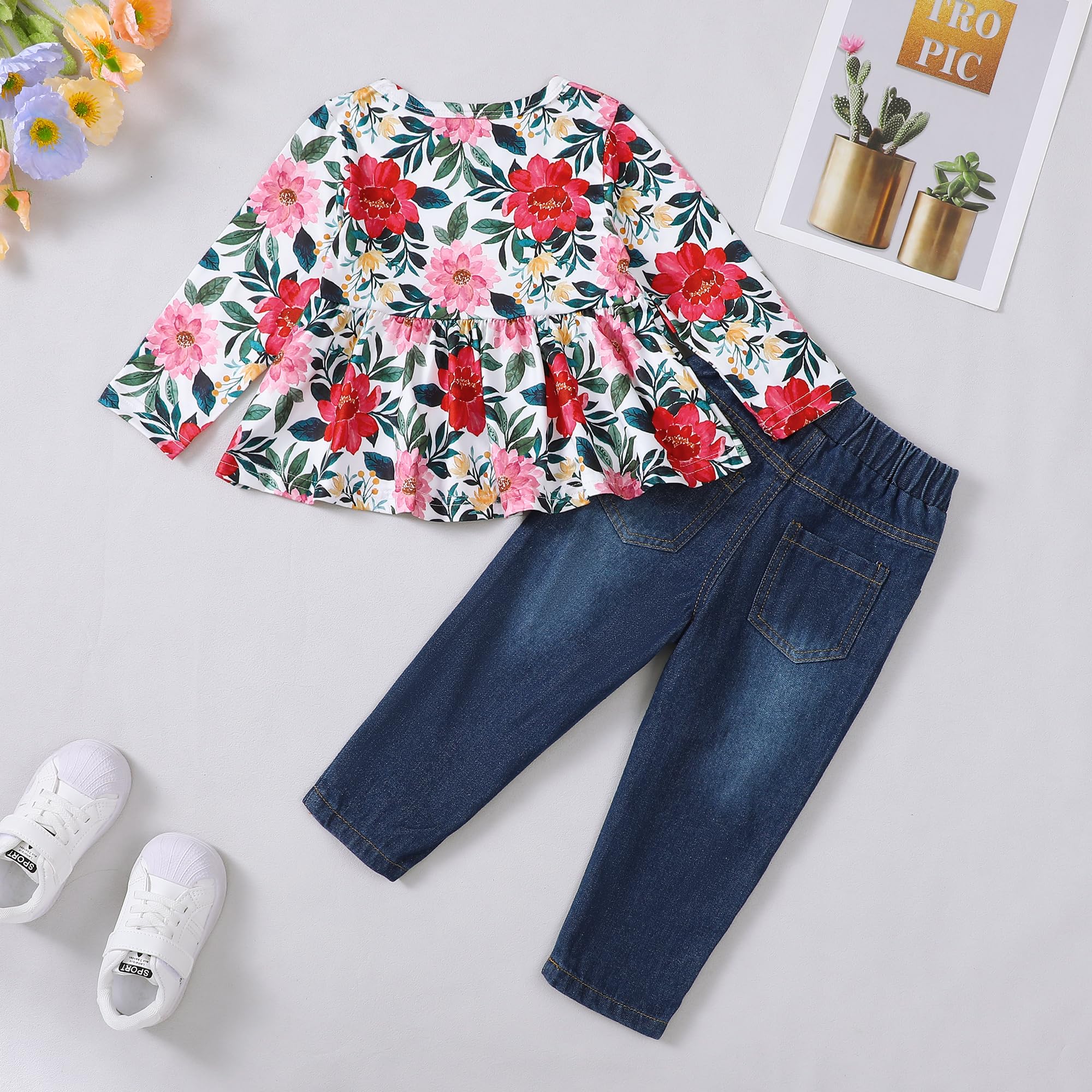 Cute Toddler Girl Clothes---Features beautiful sunflower/leopard/flower prints and cute wave hem on long sleeve shirt, matching with stylish ripped jeans, the full set adds a splash of personality to your baby girl's look.You can mix and match with other pieces in your girl's wardrobe. It’s a great foundation for any western-inspired ensemble.