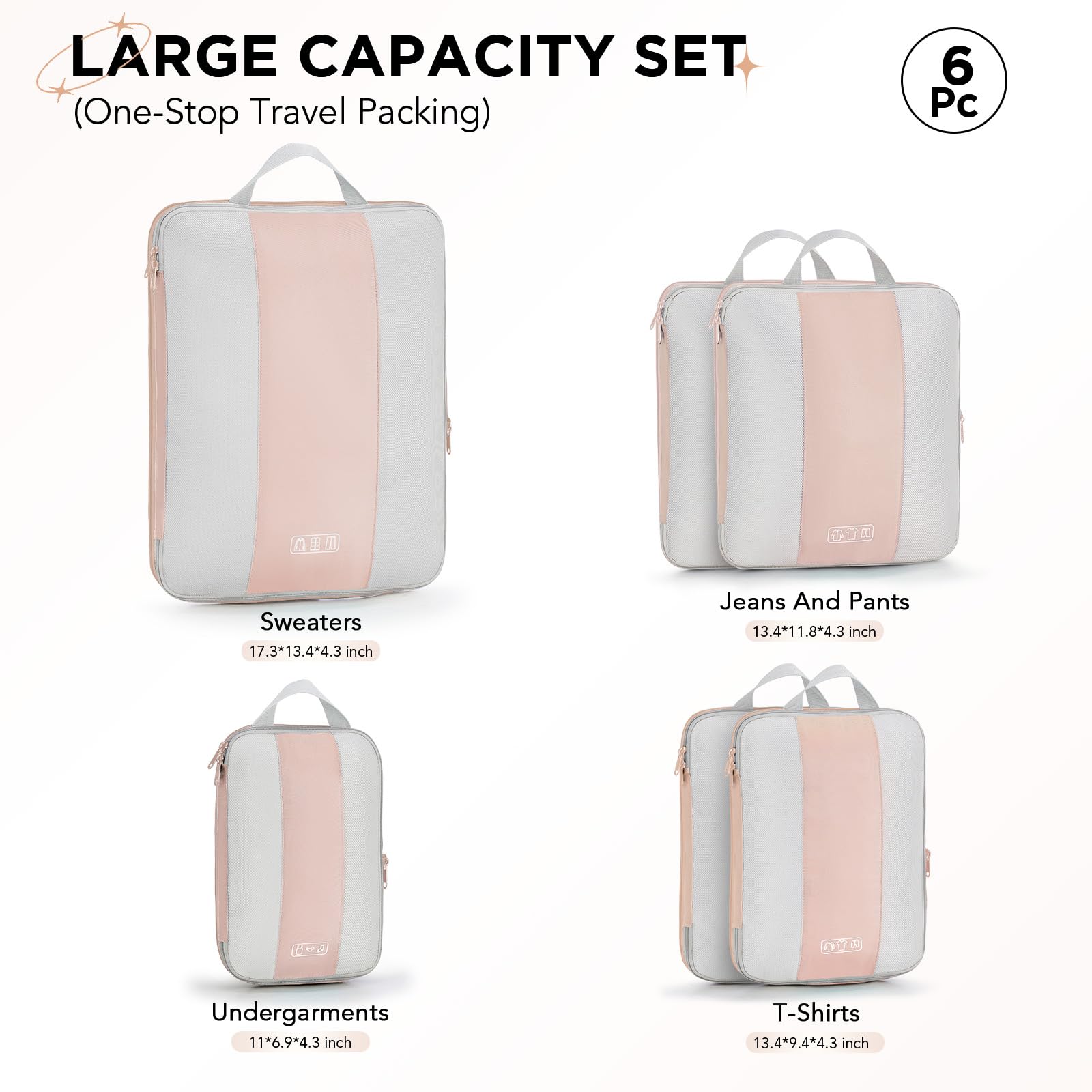 The Complete Organization System — Your Ultimate 6-Piece Packing Solution. This comprehensive set includes four distinct sizes (S, M×2, L×2, XL) to keep your luggage neatly organized and ensure an orderly start to every trip. The S cube fits undergarments; the M cubes are ideal for t-shirts and shorts; the L cubes hold pants; and the XL cube accommodates bulky sweaters and jackets.