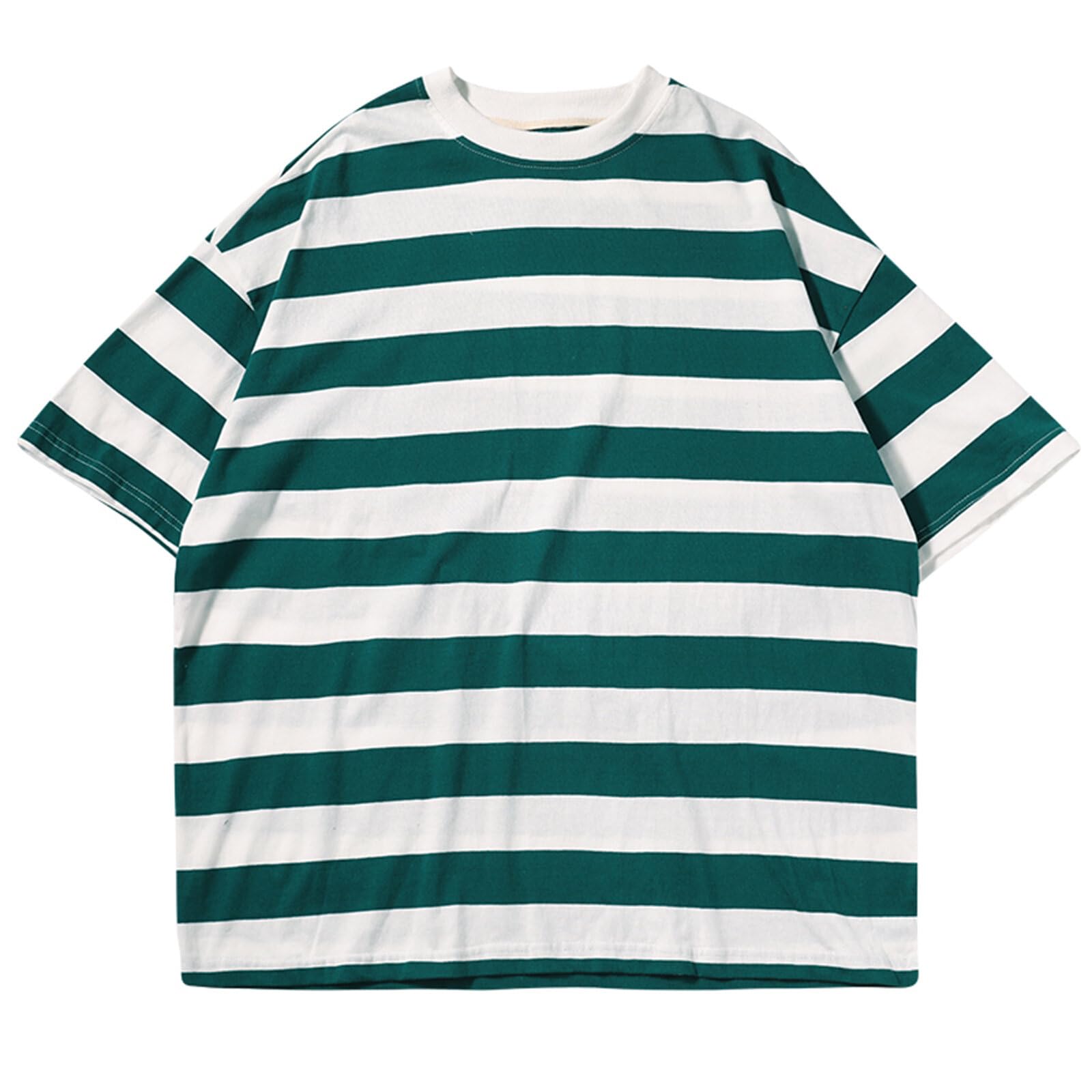 Features: This gothic pullover is designed with a round neck, stripes, short sleeves, fake two-piece design, casual loose, urban style, hip-hop style, fashionable style, unisex top, suitable for men and women.