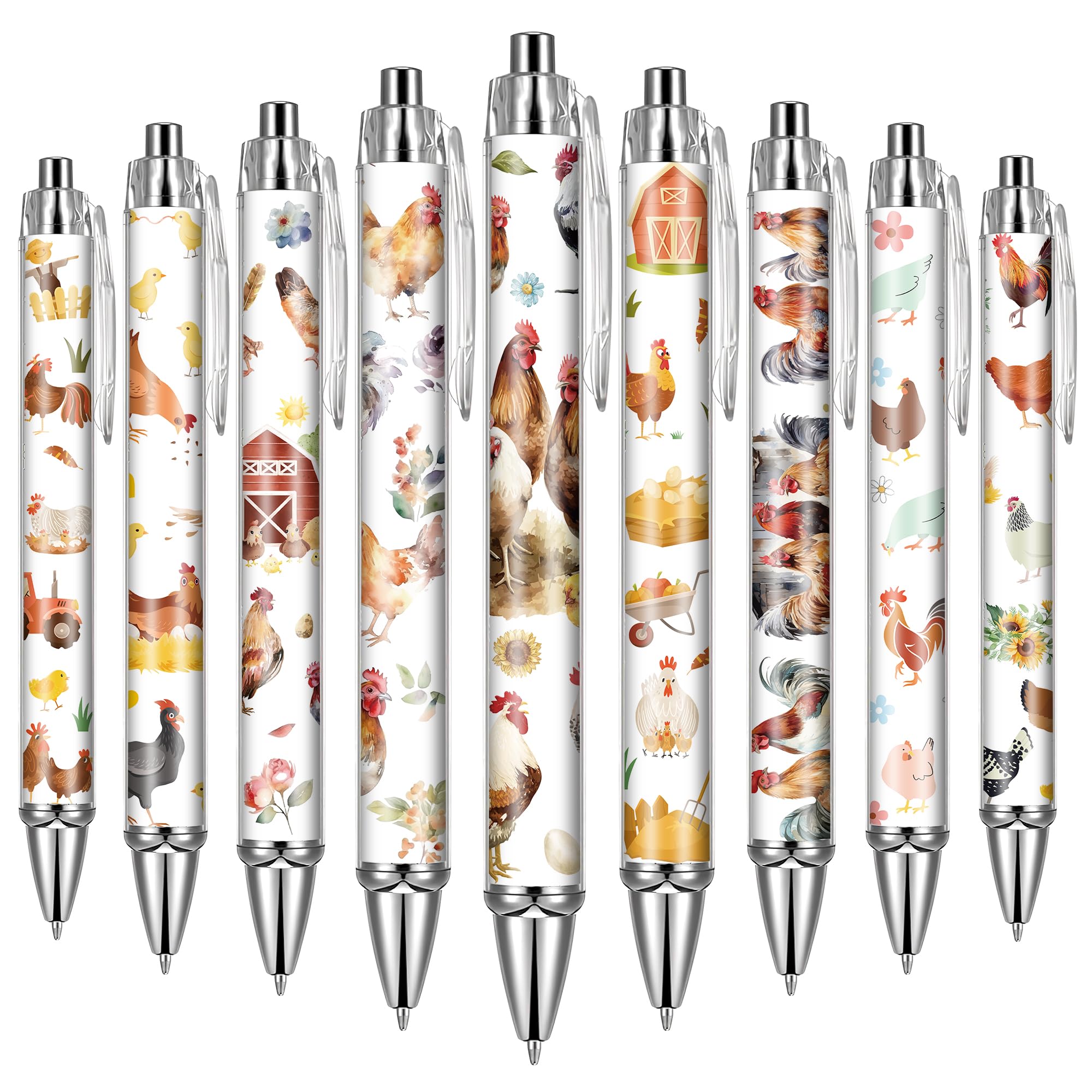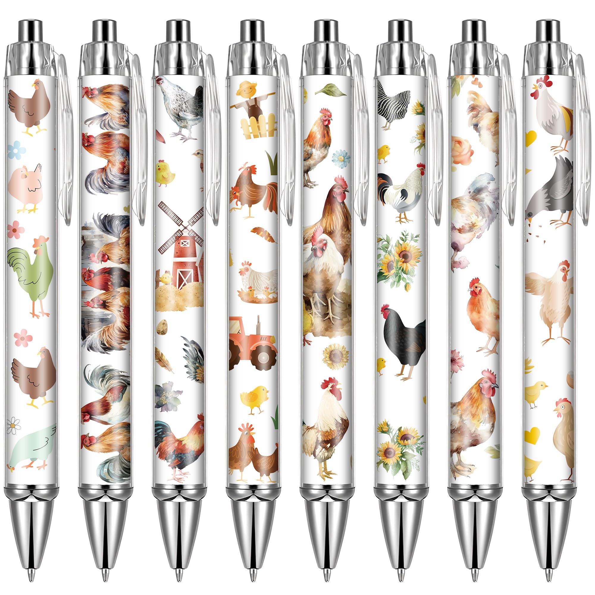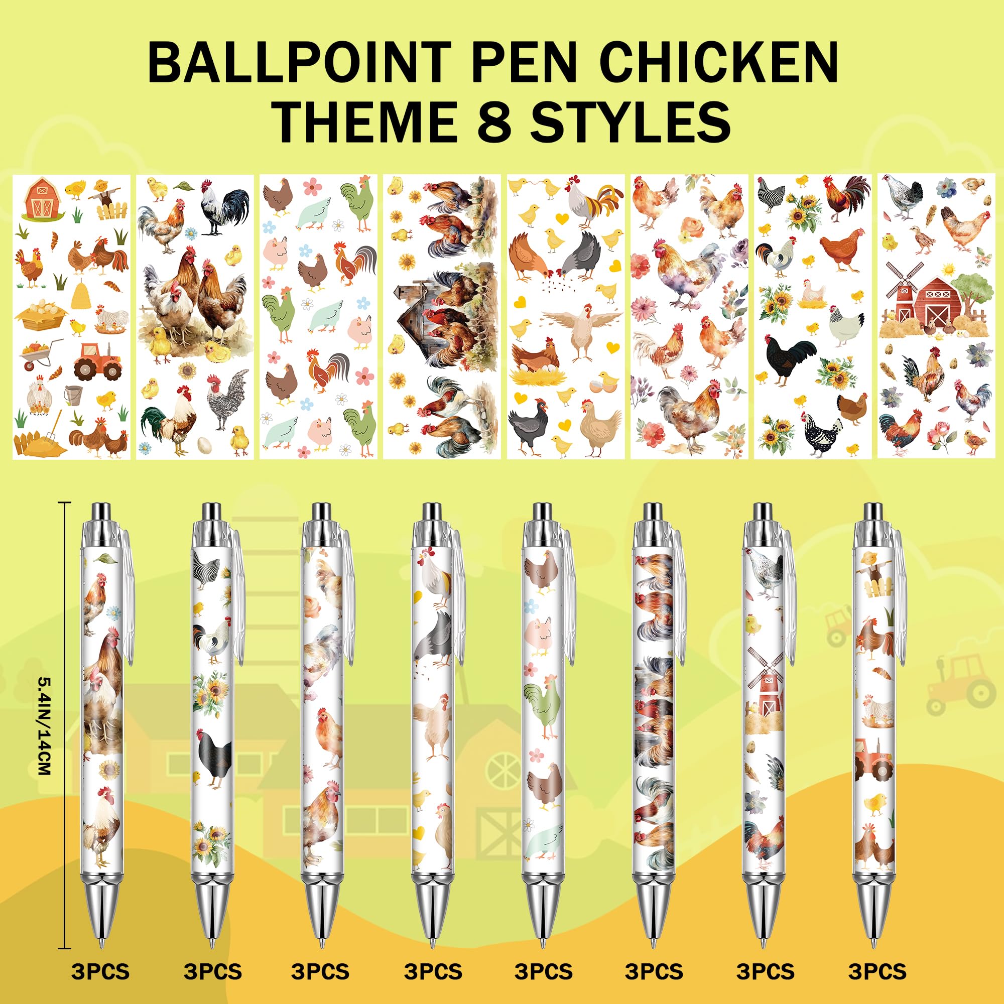 Chicken Themed Ballpoint Pen Set: The length of these pens is 5.4 inch. You will receive 24 pens with chicken theme patterns, there are 8 different patterns on the chicken theme, 3 of each pattern type. Ballpoint pens are available in sufficient quantities and styles to meet your daily writing and replacement needs, and can also be shared with others