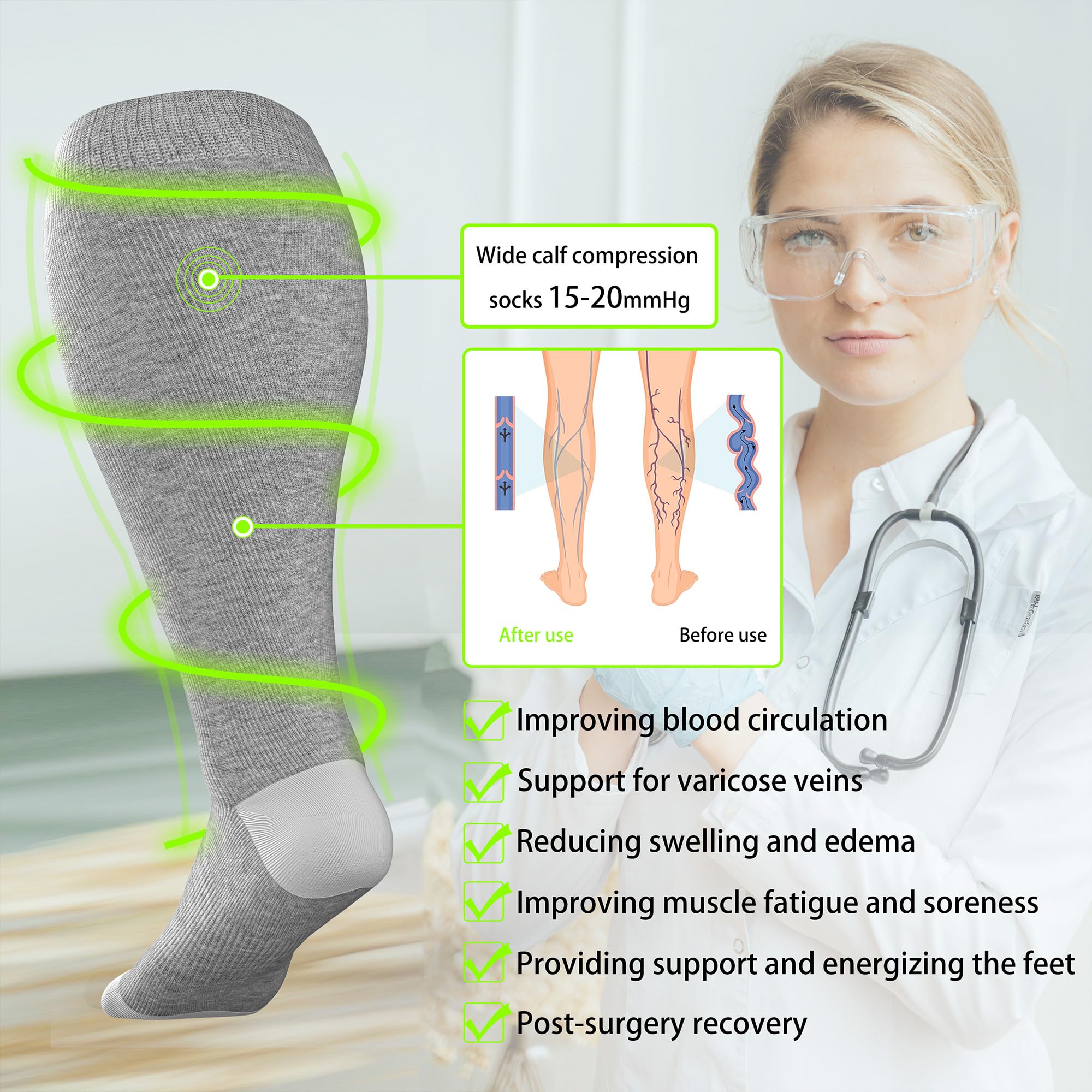 Medical Compression Socks: Extra wide calf compression socks are ideal for women prenancy and post-surgery recovery. They reduce soreness, alleviate pain from swelling during pregnancy, and provide support that eliminates fatigue and energizes the legs. Best compression Socks for nurses, physical therapist, long shift work, air plane travel, pregnant women.