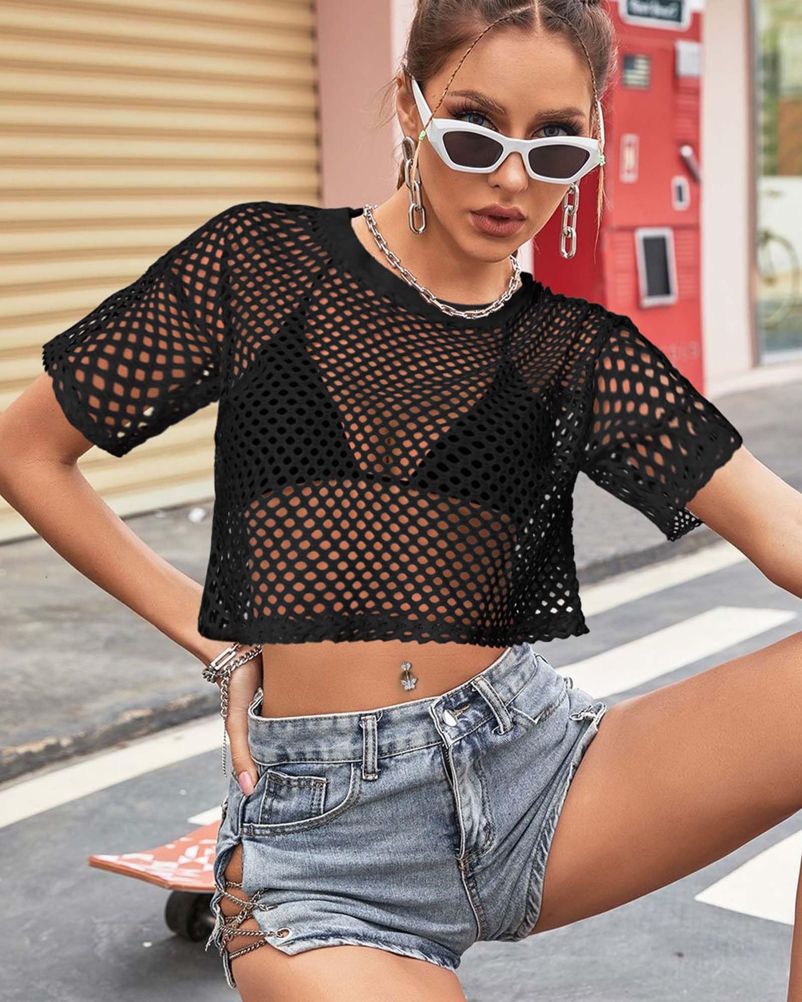 Feature: Sheer mesh crop top, see through, short sleeves, crew neck and casual style, women fishnet tee enhance your outfit with added glamour and allure;