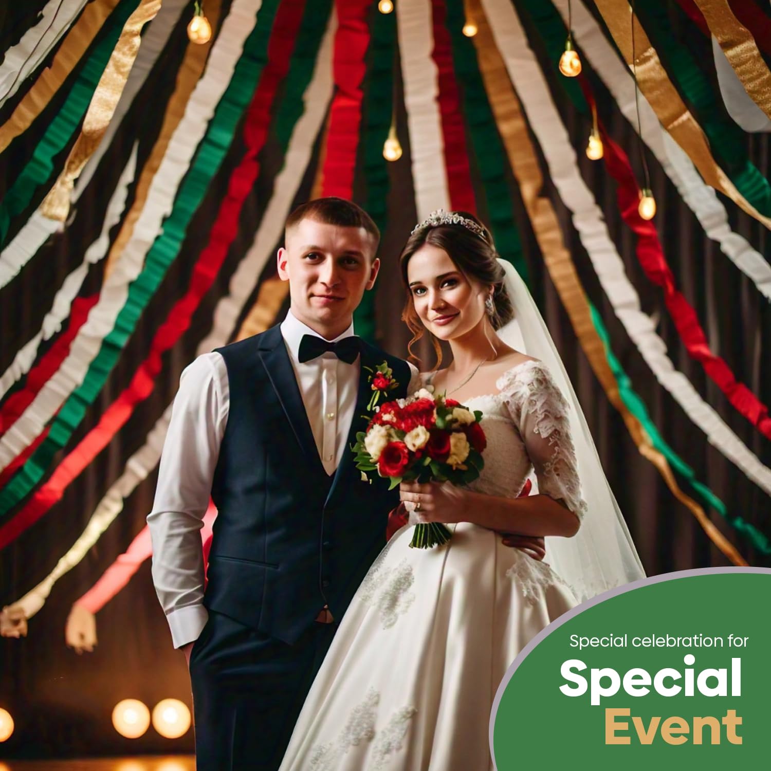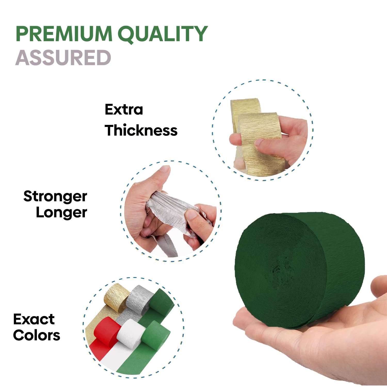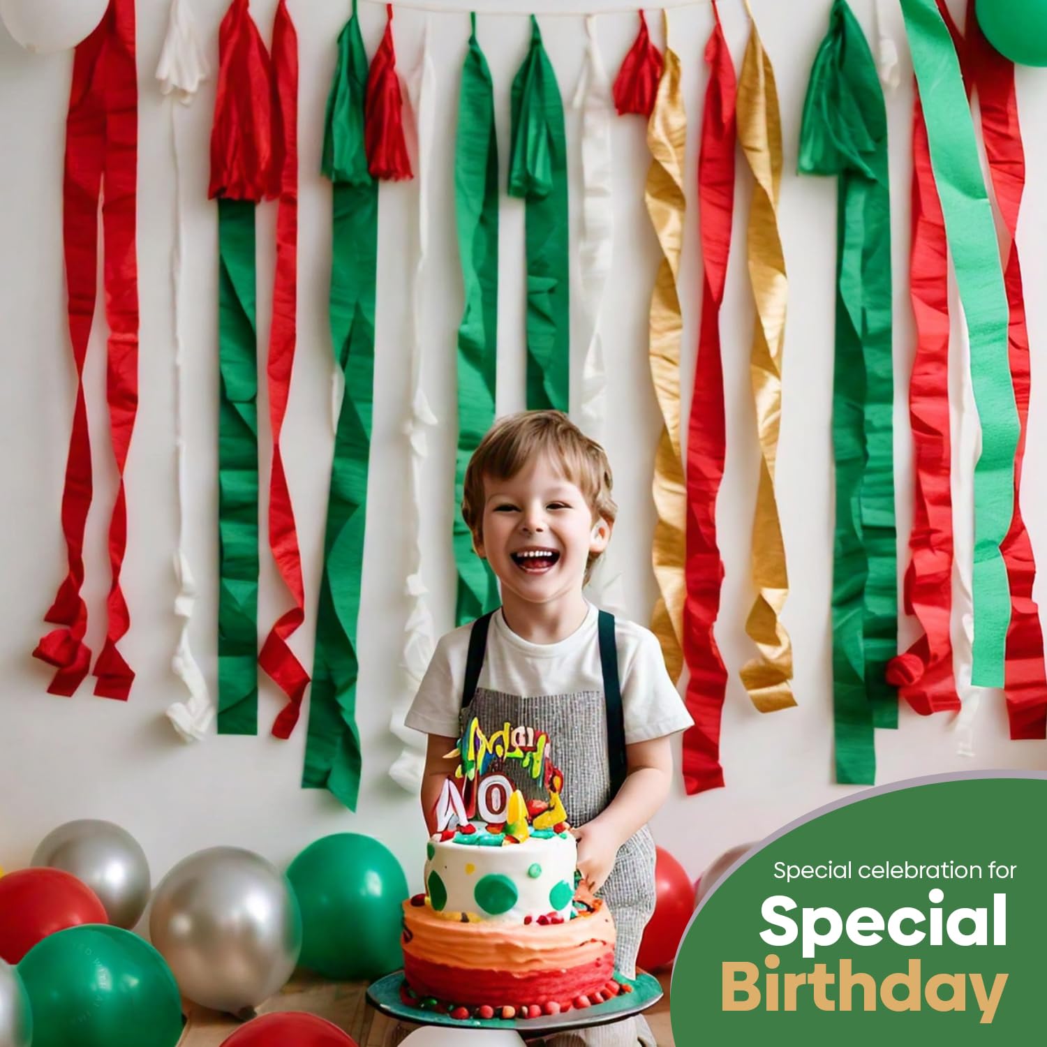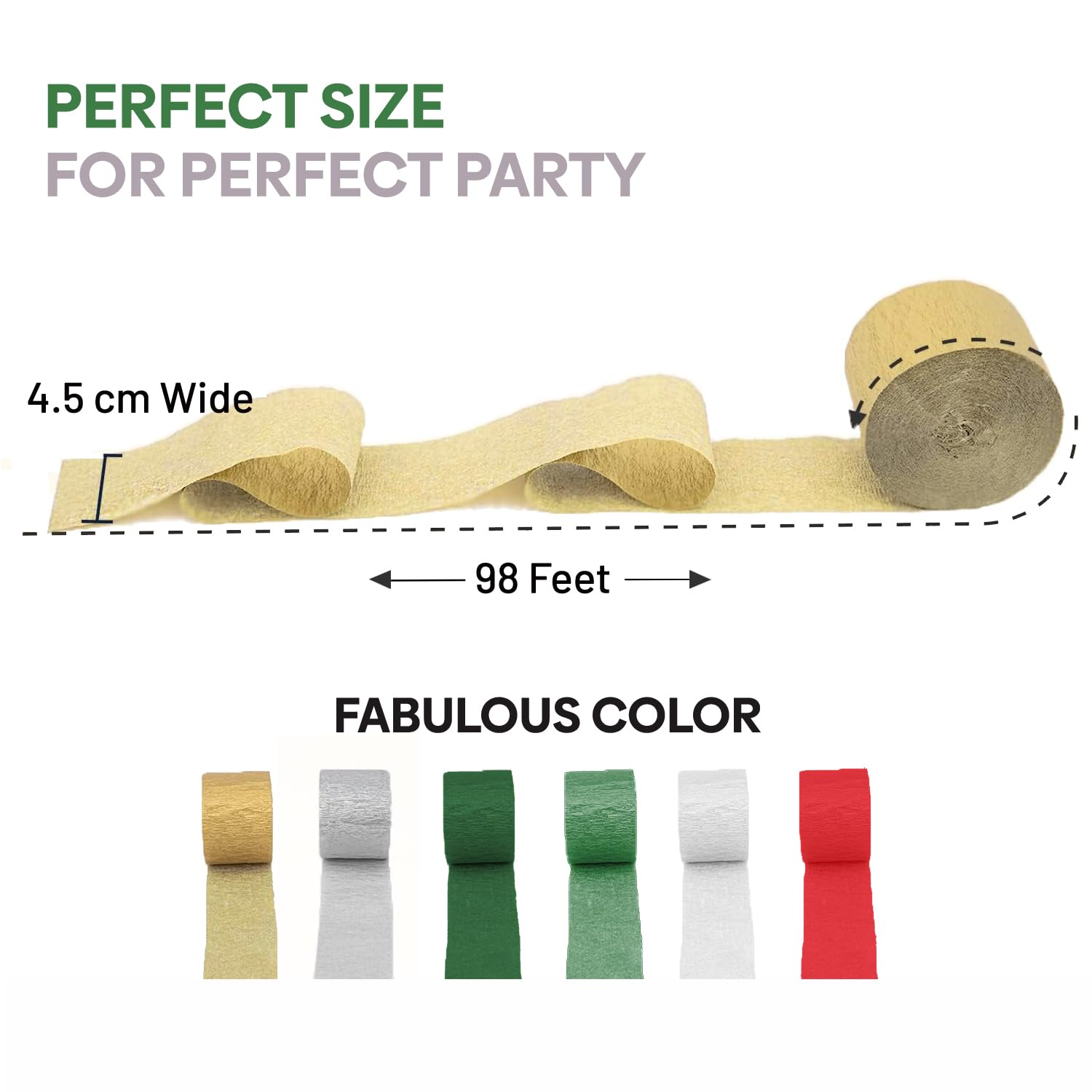 Vibrant Streamers Multipack: Our vibrant set of 6 crepe paper streamers, perfect for any festive decorations. Includes Pure White, Gold, Silver, Bright Green, Dark green & Bright Red. Each roll measures a generous 1.6 inches by 99 feet, ensuring ample coverage for large party decorations.
