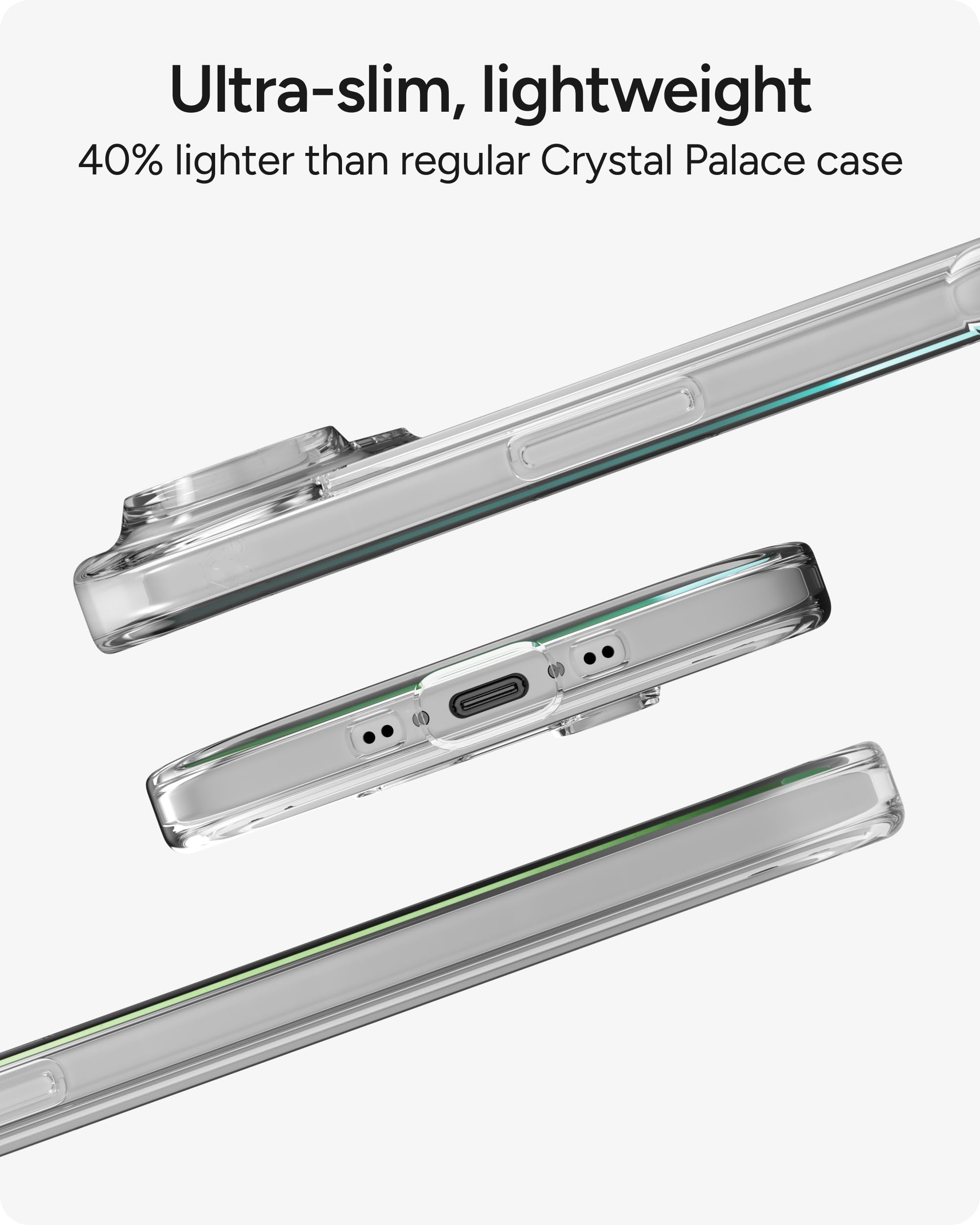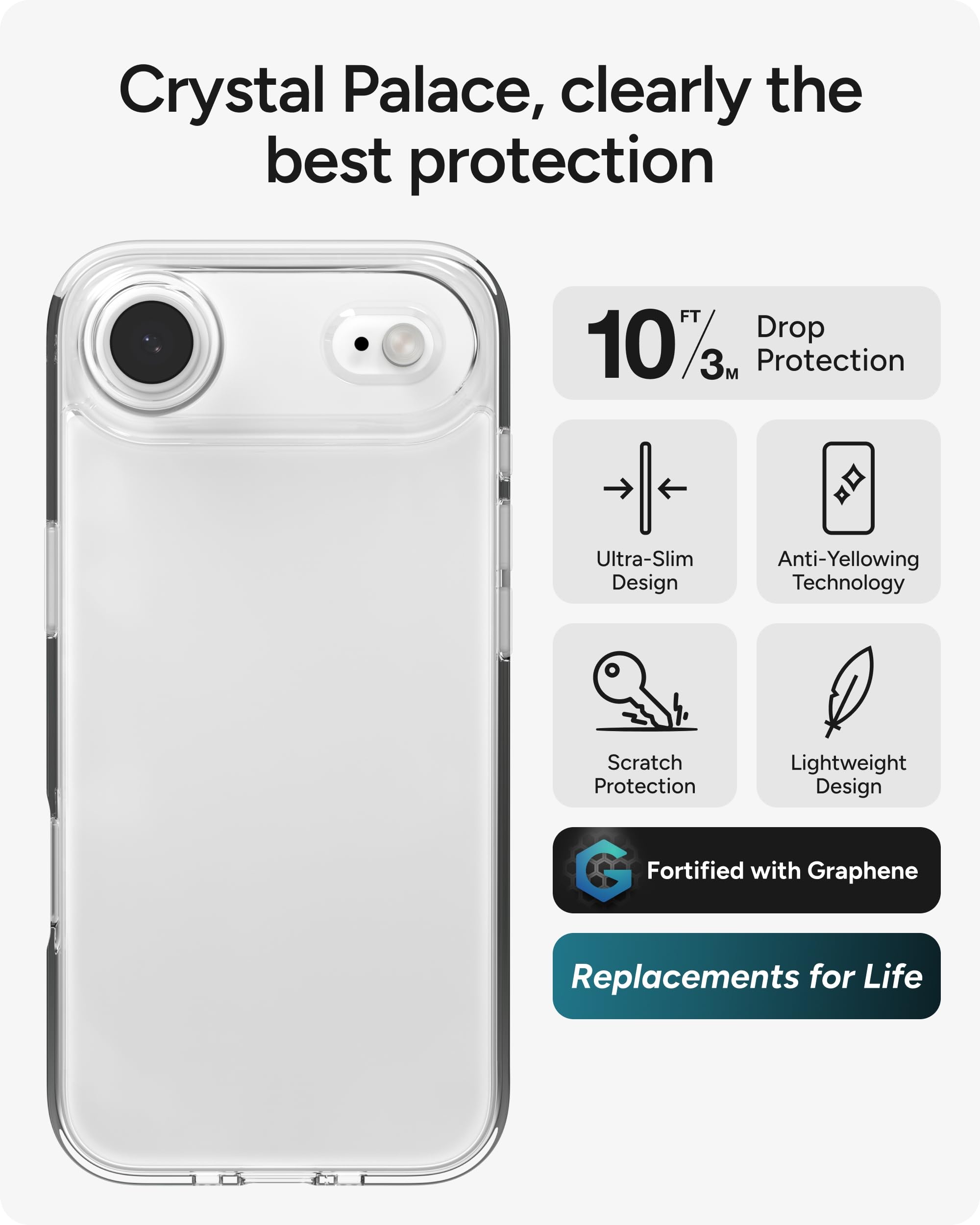 Crystal-Clear Protection for Your iPhone Showcase the beauty of your iPhone while keeping it safe with the ZAGG Crystal Palace Lite Case - an ultra-slim, lightweight, clear case that blends minimalist style with dependable drop protection. Crafted carefully to shield your phone from drops of up to 10 ft (3 m)*, it’s built for those who want both elegance and everyday durability. The Crystal Palace Lite is designed to highlight your device, not hide it. Its crystal-clear construction lets your iPhone’s design take center stage, while the anti-yellowing technology helps the case maintain its clarity over time. The sleek, streamlined profile won’t weigh you down and fits comfortably in your hand or pocket for effortless carrying. Classic and seamless, this protective iPhone case offers reliable defense against life’s everyday mishaps without compromising on looks. Whether you’re commuting, traveling, or relaxing at home, Crystal Palace Lite provides the perfect balance of protection and style, letting your iPhone stay as impressive as the day you bought it. *Mil Std 810G 516.
