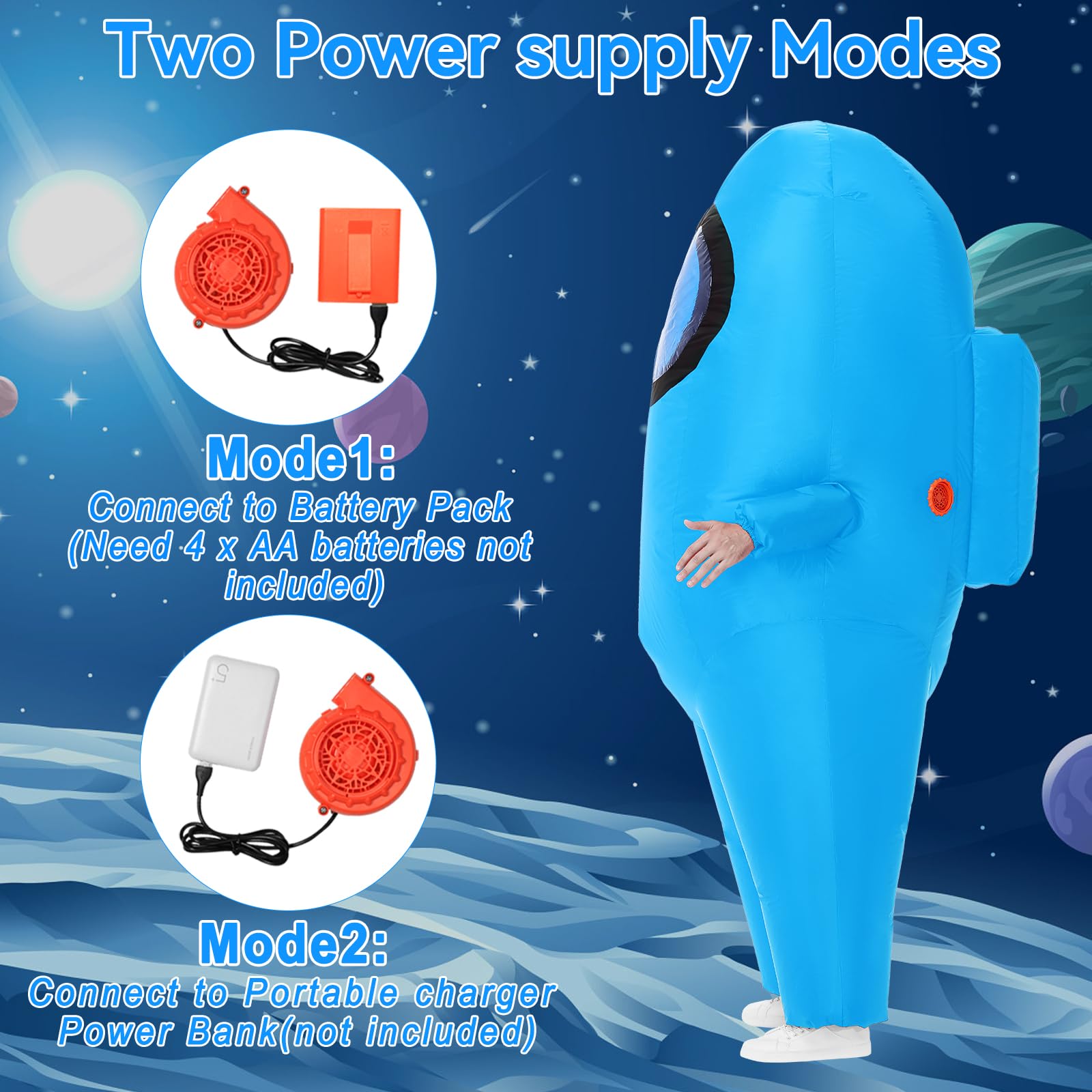 【Space Costume and Accessories】Inflatable costume includes 1 inflatable astronaut costume, 1 fan, 1 battery pack, 1 user manual, 1 drawstring bag (Quick and easy storage after use). You can choose to use the battery pack (requires 4 AA batteries, not included) or a portable power supply (sold separately) to make the blower work.