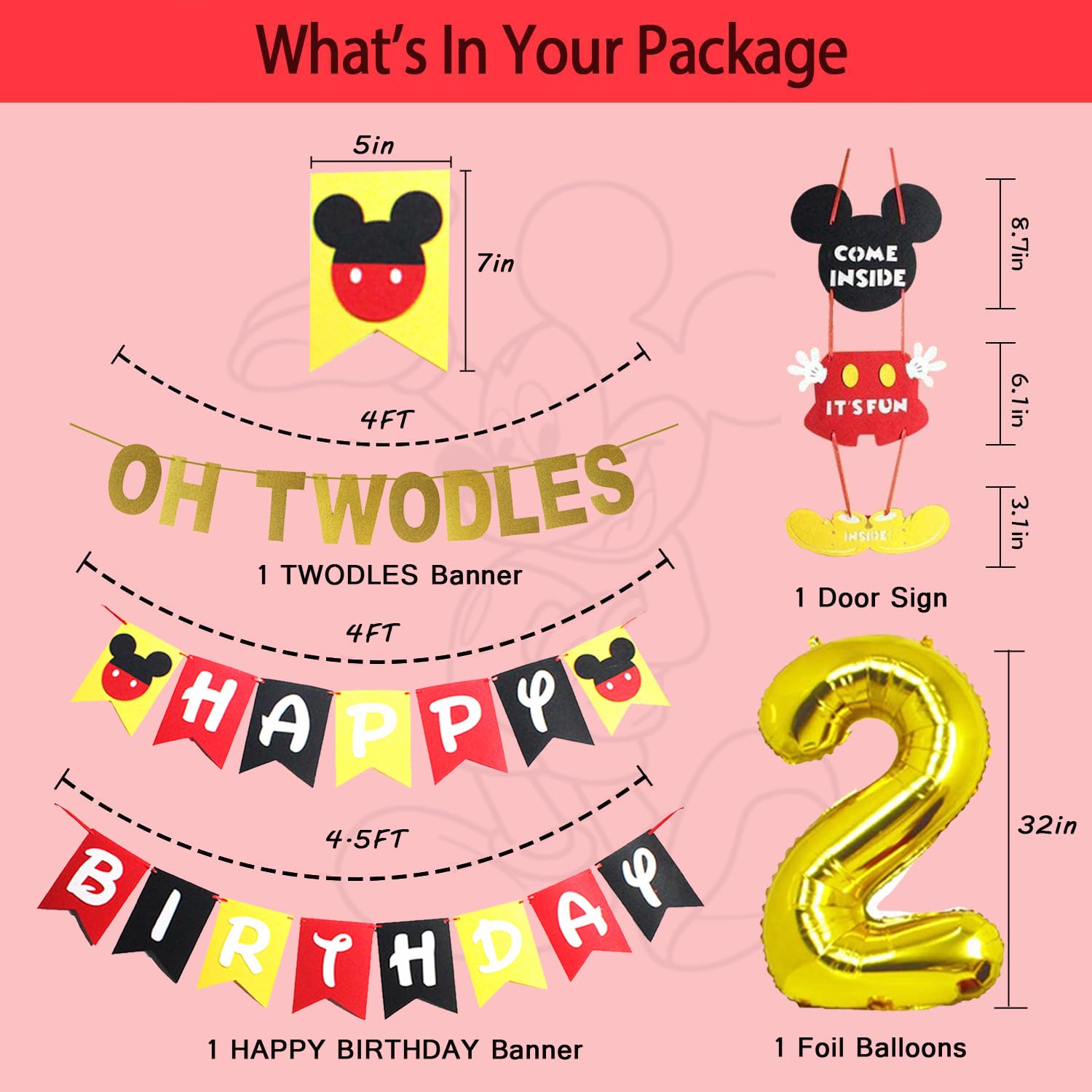 🎁One Stop Solution for Kids Second Birthday Party - One stop solution for your boy's 2nd birthday party. This valued party decorations set includes 1 HAPPY BIRTHDAY banner, 1 TWODLES banner, 1 door welcome hanger, 1 disposable cartoon mouse themed table cover, 1 number 2 foil balloon, 2 foil balloons (1 black, 1 red), 12 latex balloons and 4 confetti balloons, 1 twodles cake topper,25 cupcake toppers. All our supplies have been planned for your convenience.
