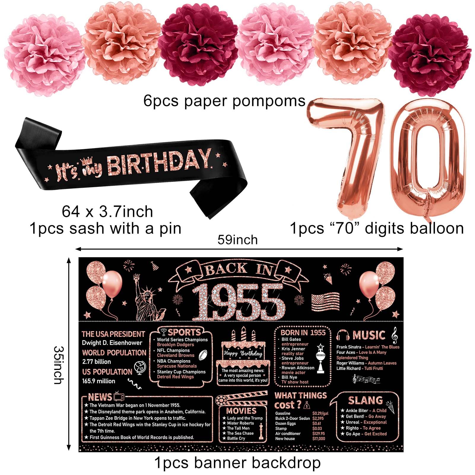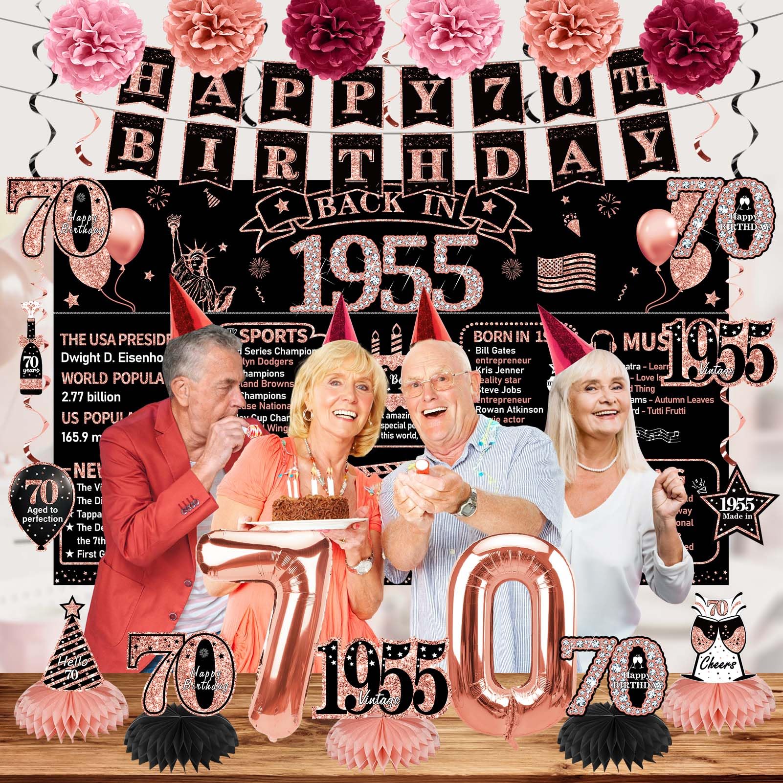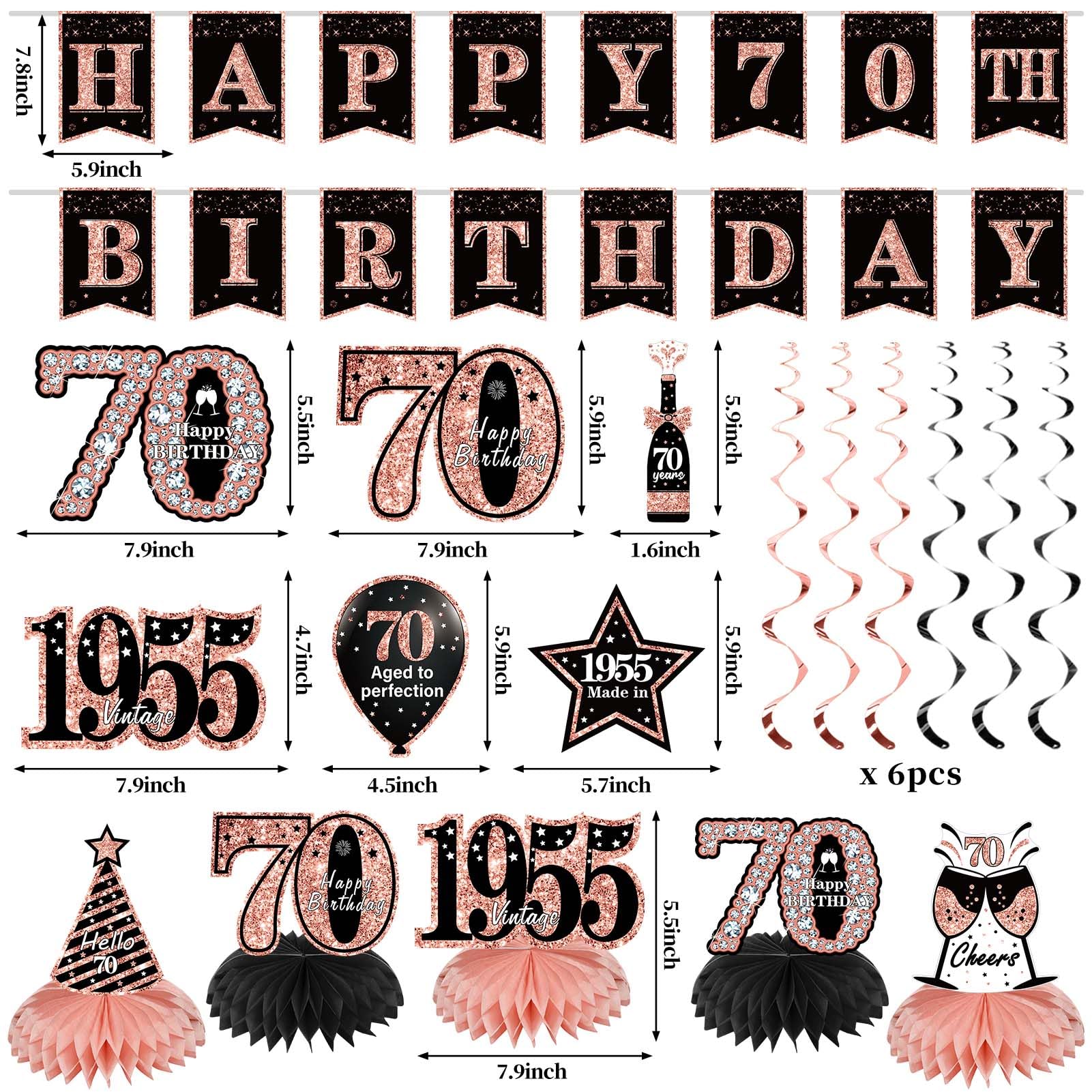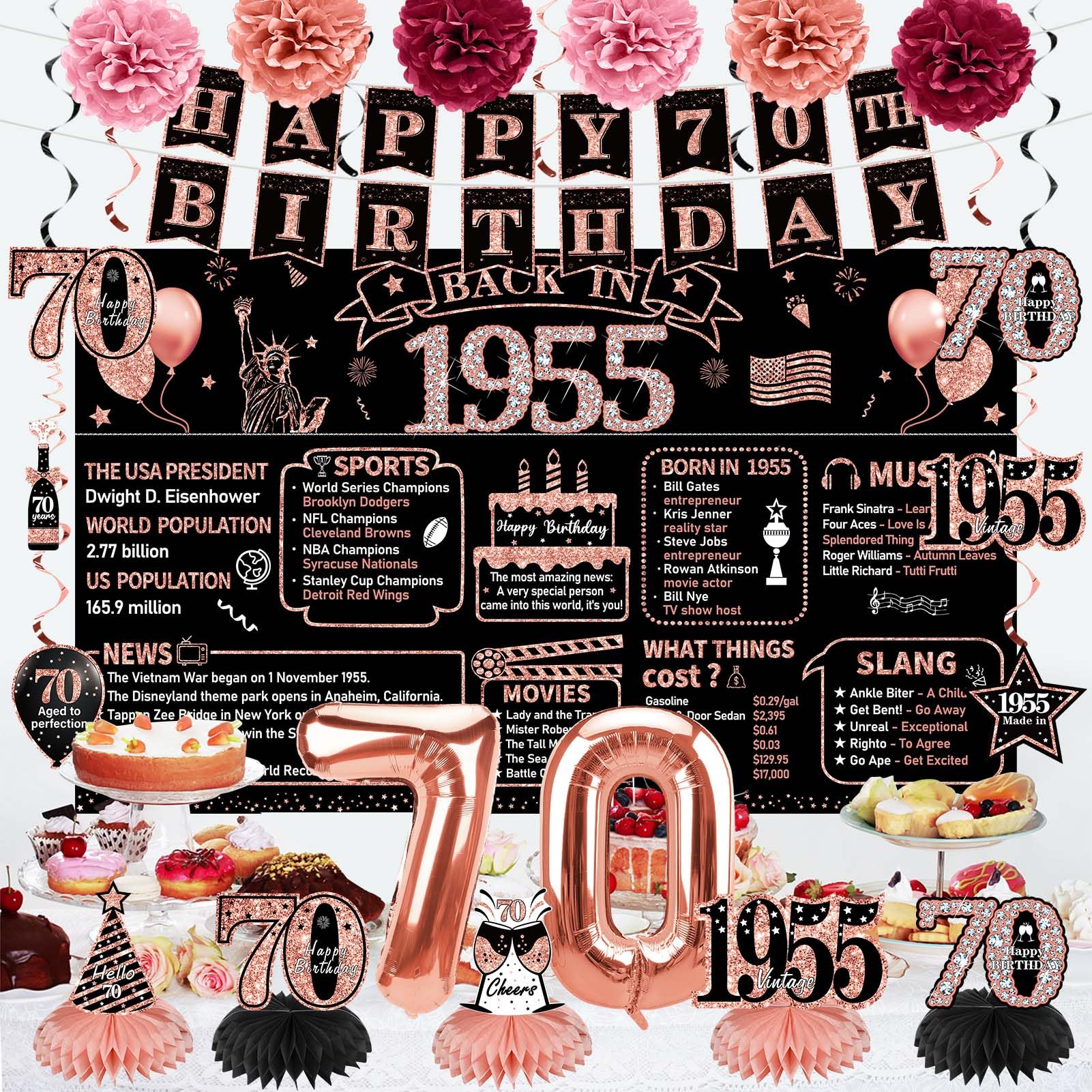 [Vintage 1955 Theme] - Designed specifically for the 70th birthday party. Among them, the banner is mainly in rose and gold color, with clear retro historical text printed on it; The set is also paired with a variety of honeycomb and swirls patterns, a large golden balloon "70", etc.