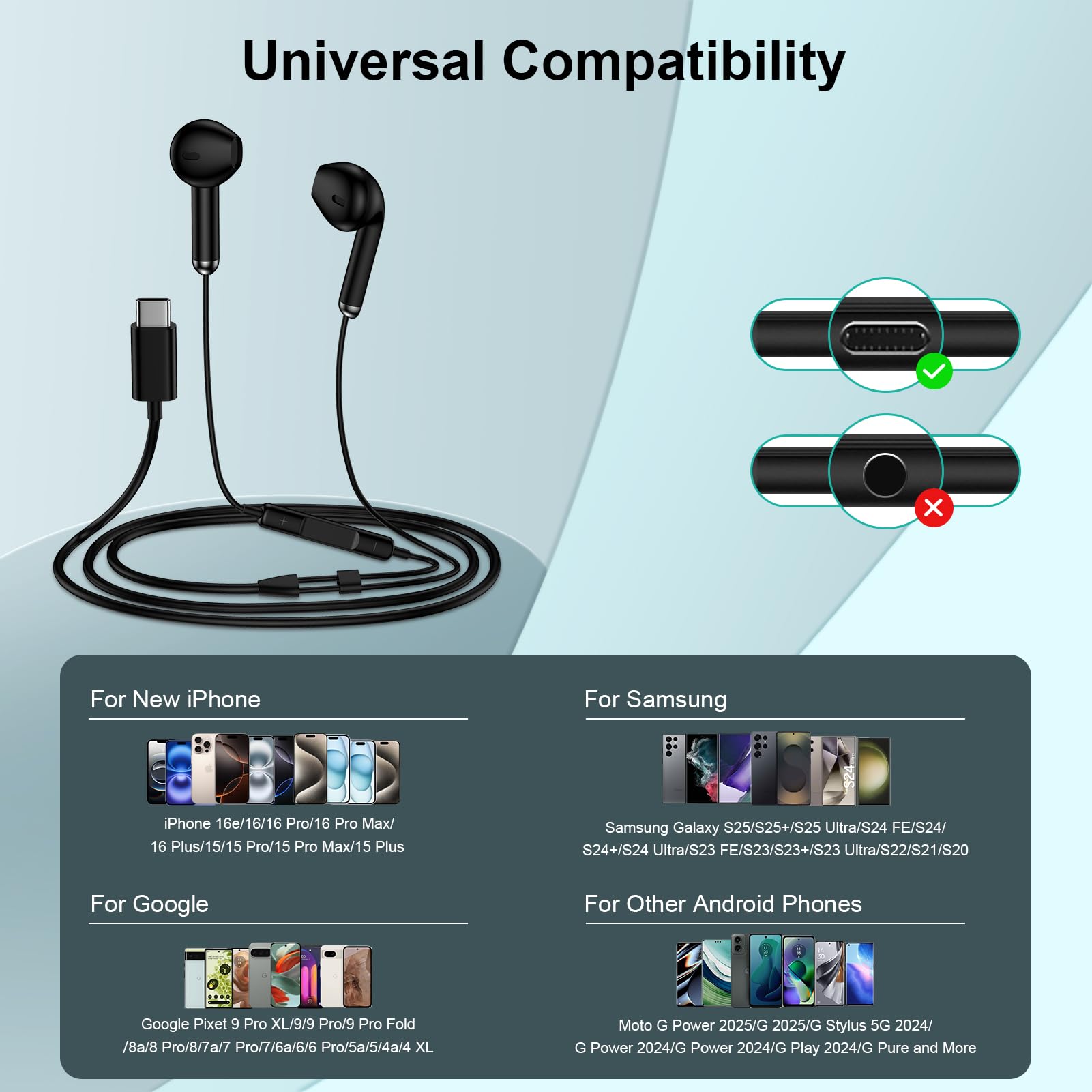 Universal Compatibility: Samsung headphones wired usb c compatible with Galaxy S26/S26+/S26 Ultra/S25 Edge/S25/S25 Ultra/S25+/S24 FE/S24/S24 Ultra/S24+/S23 FE/S23/S23 Ultra/S23+/S22/S22+/S22 Ultra/S21 FE/S21 Ultra/S20/Note 20/Z Flip 7 FE 6 5 4 3/Z Fold 7 6 5 4 A17 A56 A36 A25 A16 A55 A35 A25 A15 A54 A14 A53 A23 A13, iPhone 17e/17 Pro Max/17/Air/16e/16/16 Plus/16 Pro Max/15/15 Plus/15 Pro Max, iPad Pro/Mini 6/Air, MacBook Pro 13" 14" 16", Google Pixel 10 Pro XL 9a 9 Pro Fold 8a 8 7a 7 6a 6 5a