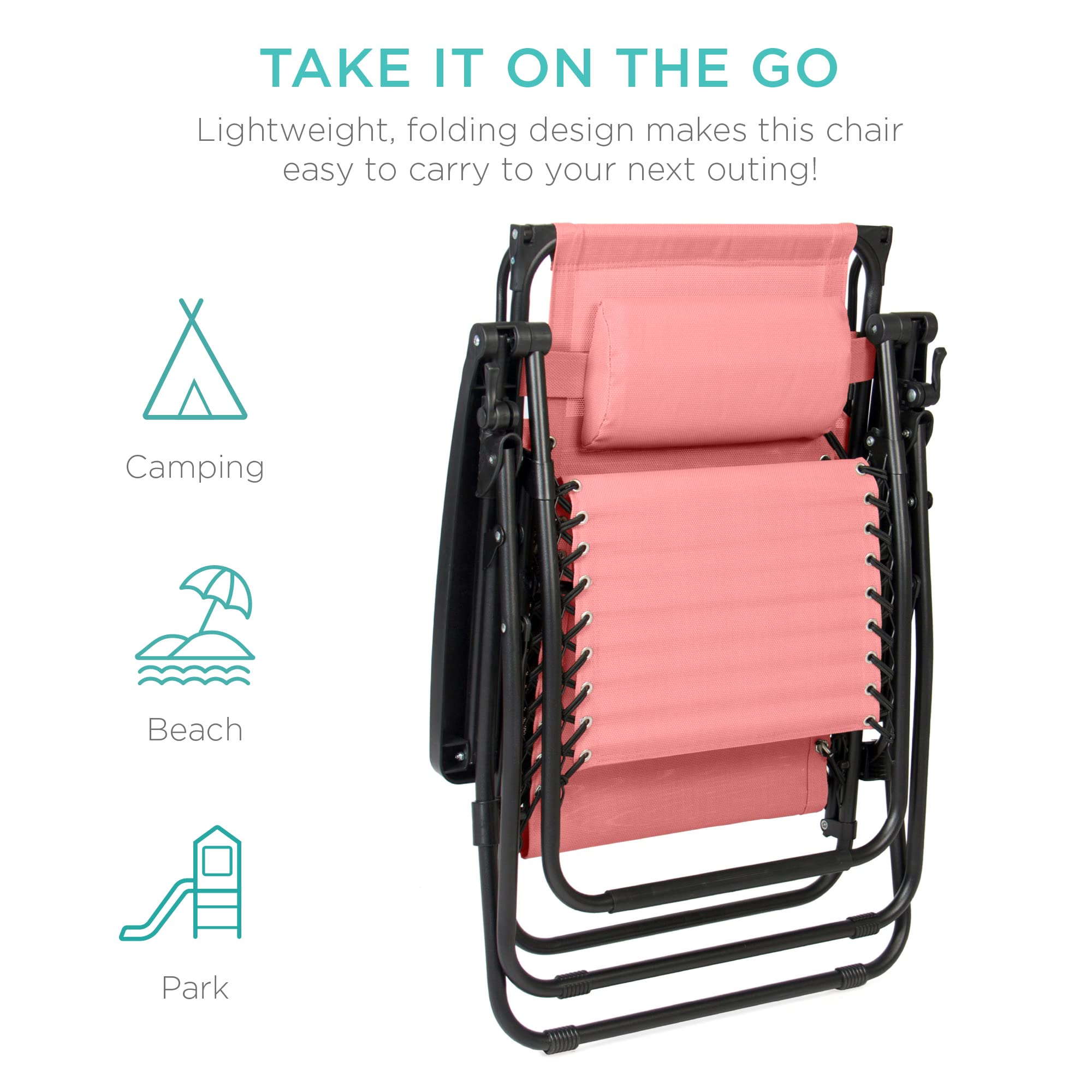 TAKE IT ON THE GO: A lightweight, folding design makes this chair easy to enjoy at home, the beach, the park, or your next tailgate; OPEN DIMENSIONS: 34"(L) x 27"(W) x 49"(H); FOLDED DIMENSIONS: 27"(L) x 7.5"(W) x 37.5"(H); WEIGHT CAPACITY: 250lbs.