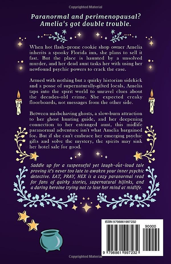 Paranormal and perimenopausal? Amelia's got double trouble. When hot flashβprone cookie shop owner Amelia inherits a spooky Florida inn, she plans to sell it fast. But the place is haunted by a unsolved murder, and her dead aunt tasks her with using her newfound psychic powers to crack the case. Armed with nothing but a quirky historian sidekick and a posse of supernaturally-gifted locals, Amelia taps into the spirit world to unravel clues about the decades-old crime. She expected creaky floorboards, not messages from the other side. Between misbehaving ghosts, a slow-burn attraction to her ghost hunting guide, and her deepening connection to her estranged aunt, this midlife paranormal adventure isn't what Amelia bargained for. But if she can't embrace her emerging psychic gifts and solve the mystery, the spirits may sink her hotel sale for good. Saddle up for a suspenseful yet laugh-out-loud tale proving it's never too late to awaken your inner psychic detective. EAT, PRAY, HEX is a cozy paranormal read for fans of quirky stories, supernatural hijinks, and a daring heroine trying not to lose her mind at midlife.