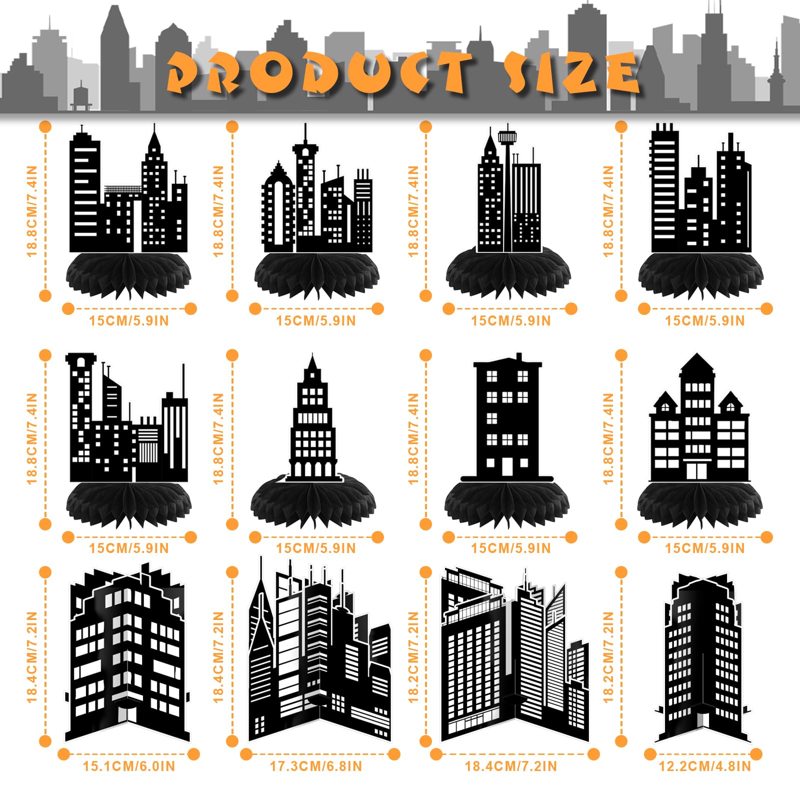 Packaging Information: there are 12 pieces city honeycomb centerpiece, including 12 different black skyscraper design etc. Whether you are holding a small party or a large party, our packaging can ensure that the corner of your activity place is covered to enhance the atmosphere