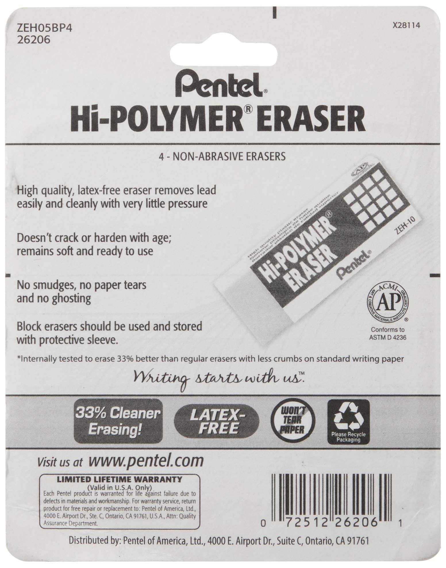 High quality latex-free eraser removes lead easily and cleanly with very little pressure