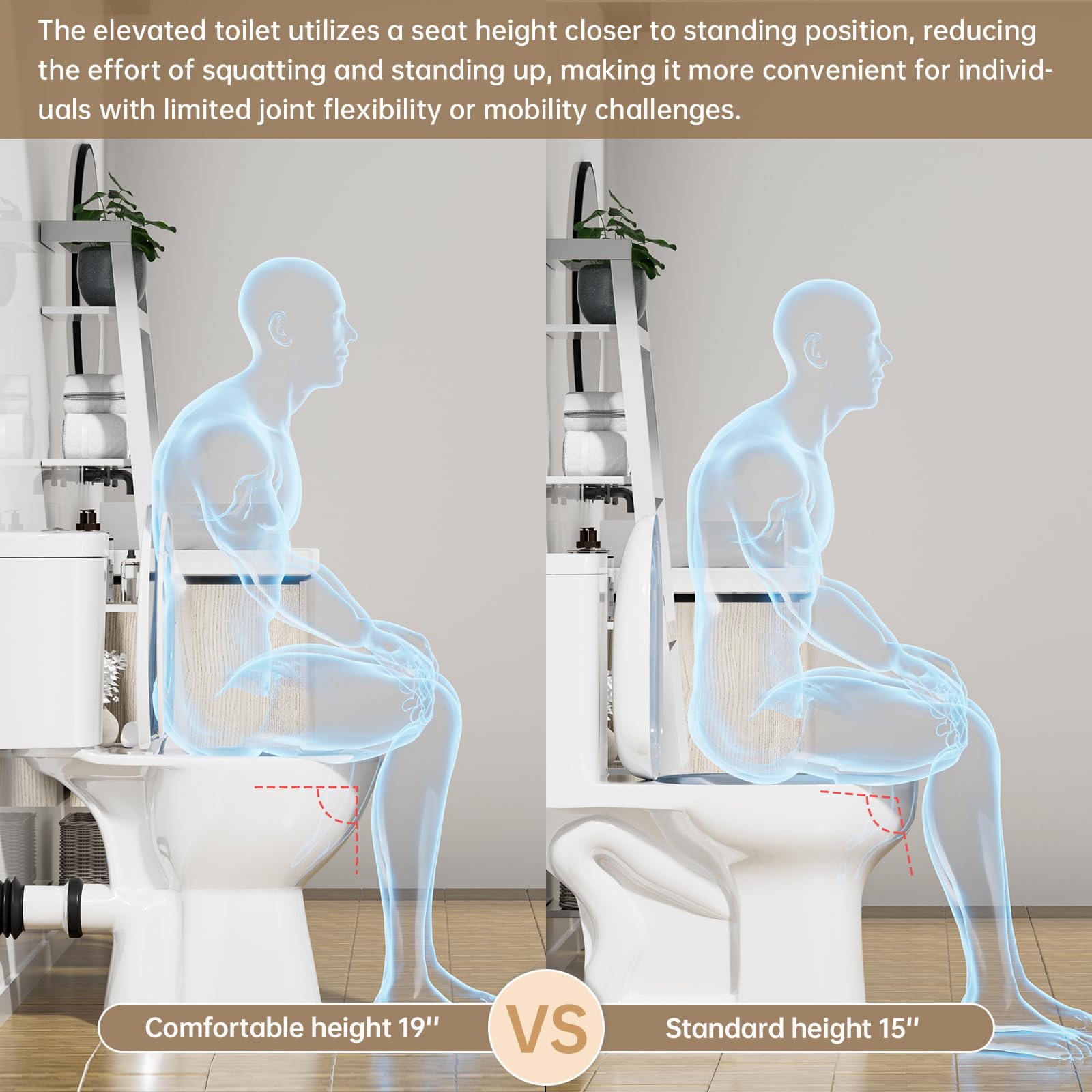Elevated Design: Rear Discharge Toilet features a 19-inch tall toilet bowl height, providing increased convenient height for seniors or individuals with mobility challenges, ensuring ease of use.