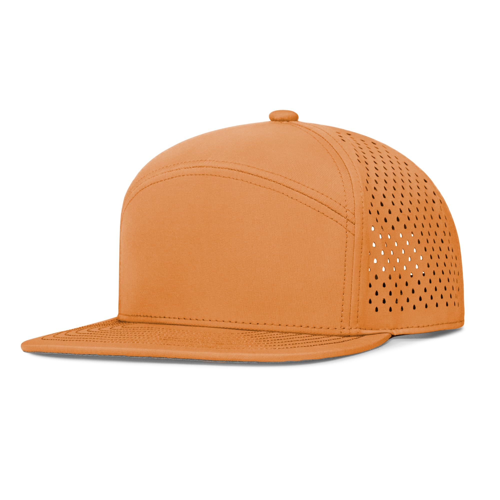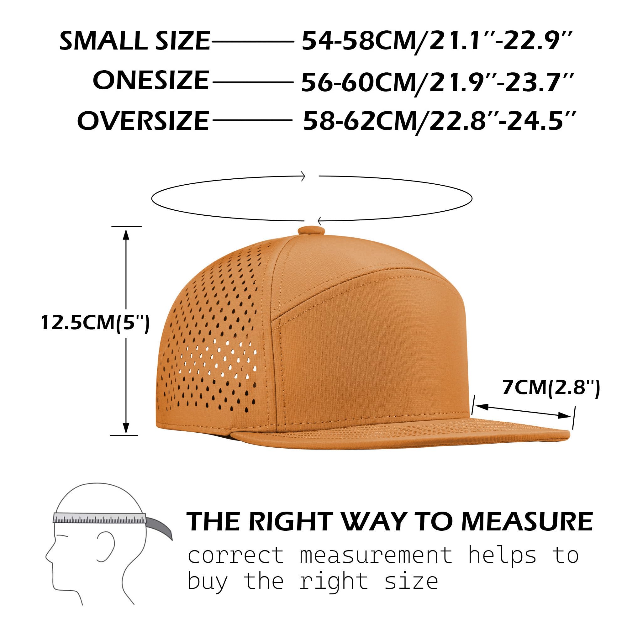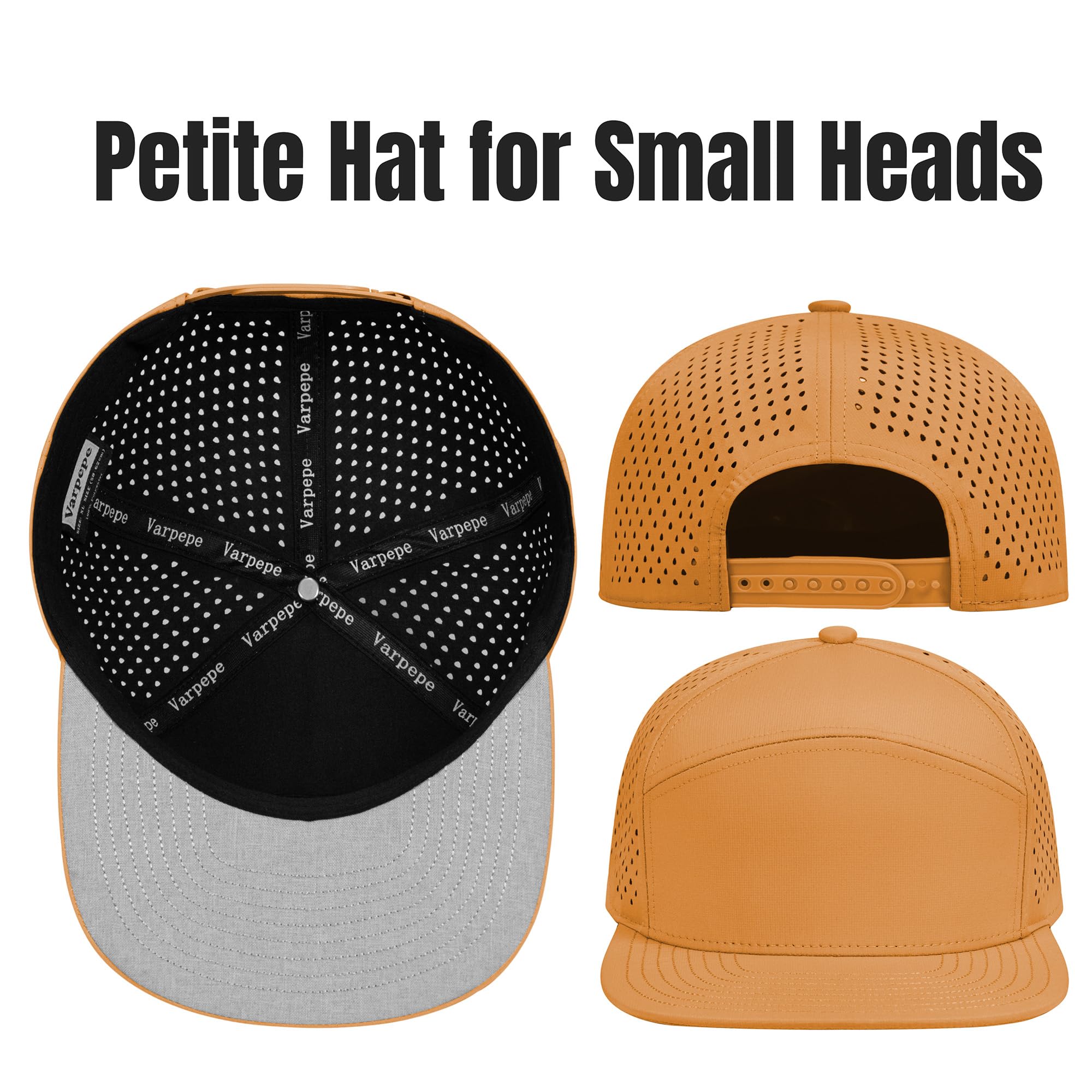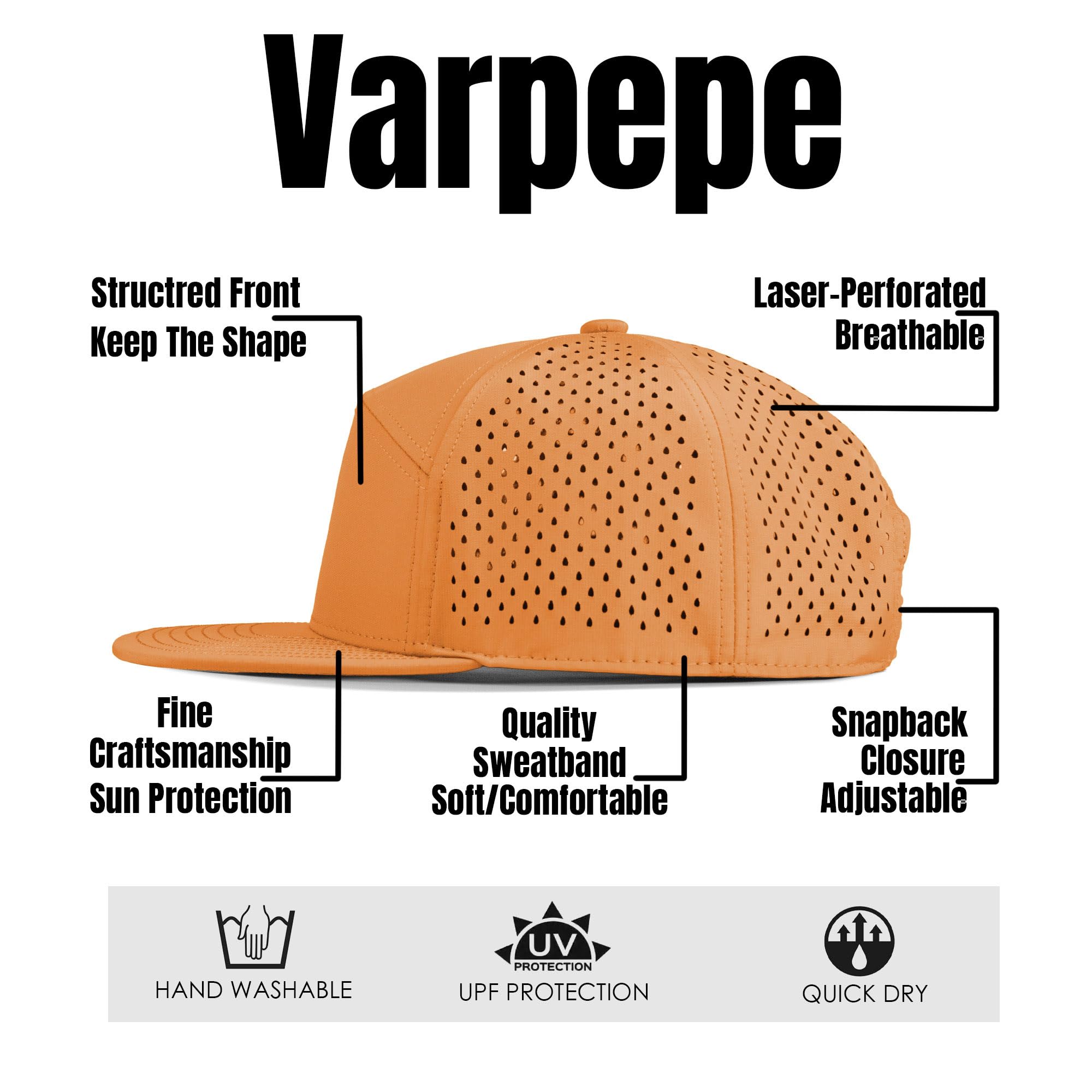 Varpepe Hat Design: Stylish and functional,structured front panels that maintains shape, 6-panel, flat brim, laser-perforated side & rear panels for breathability, and soft touch adjustable snapback closure