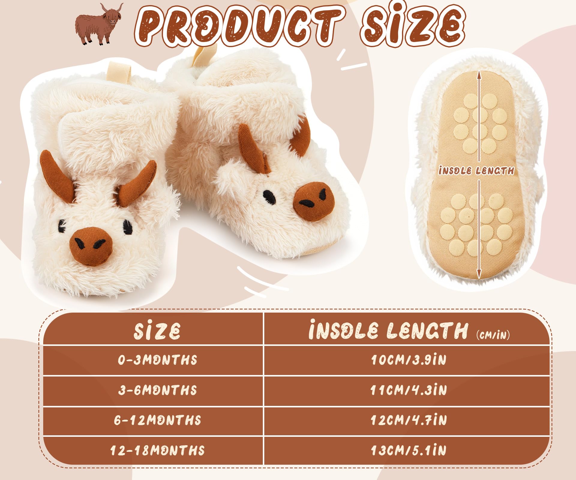Description Features: Our booties feature non-skid soles to prevent your baby from slipping and falling when they start to walk and run. Specifications: Material: cotton Color: as the picture shows Size: 4.72 inch/6-12 Months Package includes: 1 Pair of highland cow slippers Notes: Manual measurement, please allow slight errors on size. The color may exist a slight difference due to different screen displays.