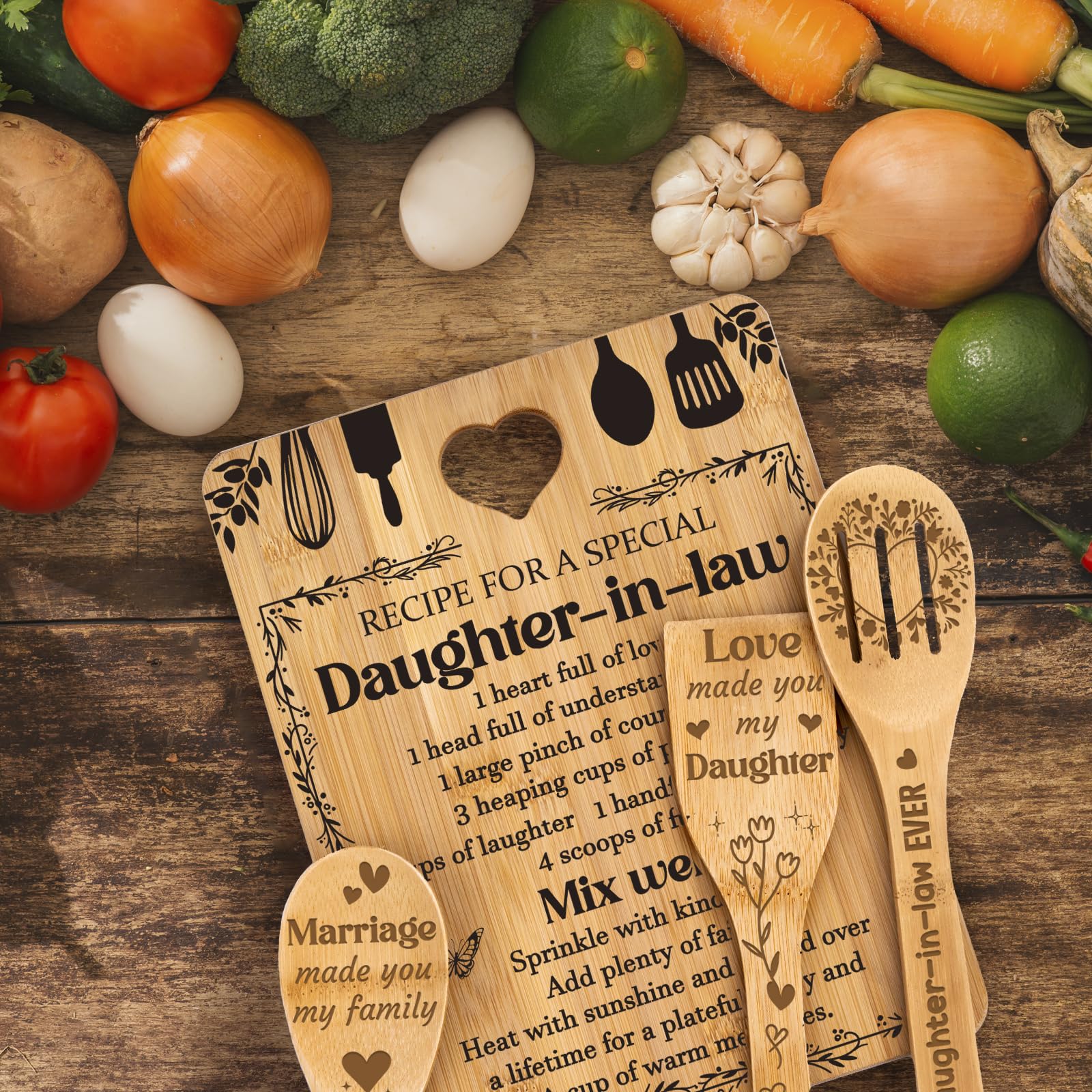 Daughter in Law Gifts - Apjielop daughter-in-law gifts cutting boards, spatulas, soup spoons, and colanders are all crafted from 100% natural bamboo, making them not only environmentally friendly but also durable, lightweight, and visually appealing, excellent moisture absorption, breathability, ensuring hassle-free cleaning and maintenance. Designed with heart-shaped handles, our daughter in law gifts chopping boards offer convenience and portability, elevate every culinary experience.